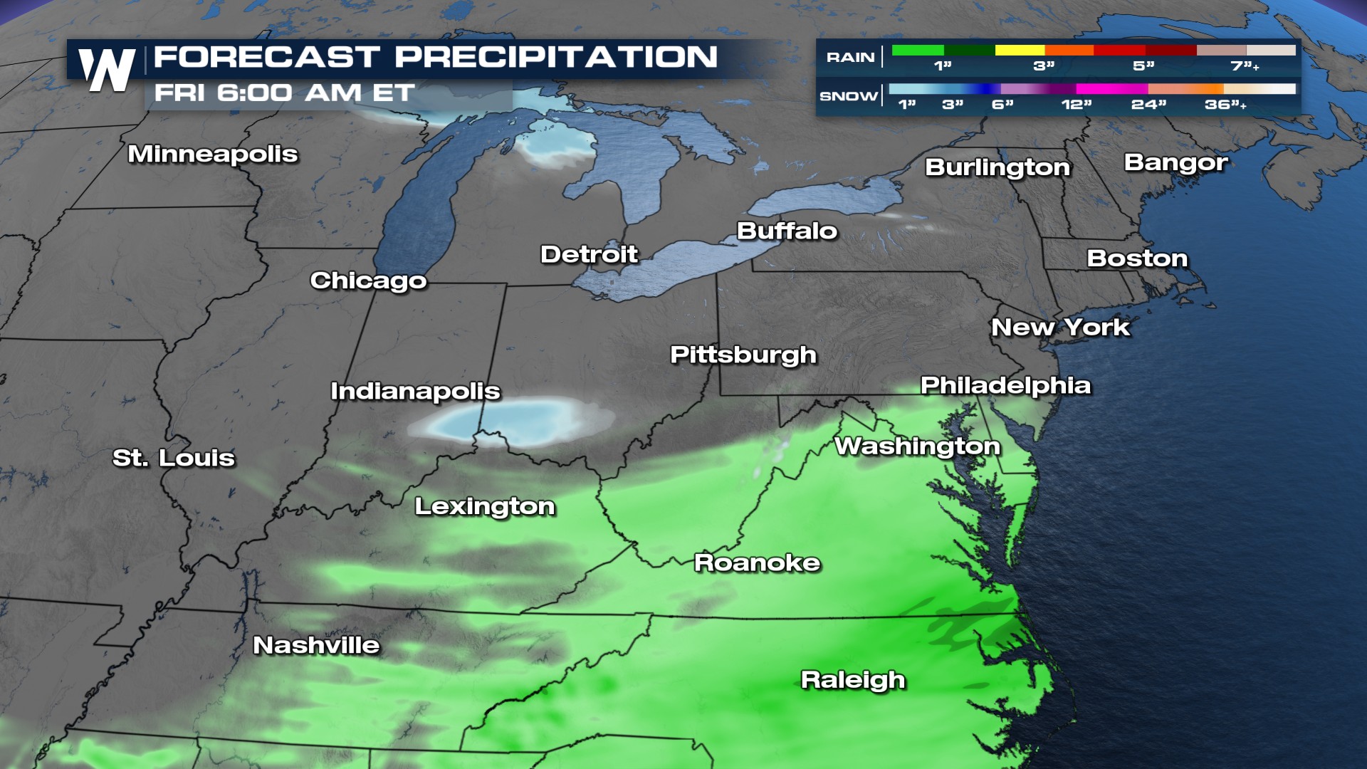 Light to moderate snowfall will move out of Indiana and Ohio Thursday morning. Another little batch of snow could move back to the I-95 corridor as we head into your late Thursday. Mostly rain is going to plague the Mid-Atlantic and Mis-South through Thursday, as this system moves off the coast later in the day.