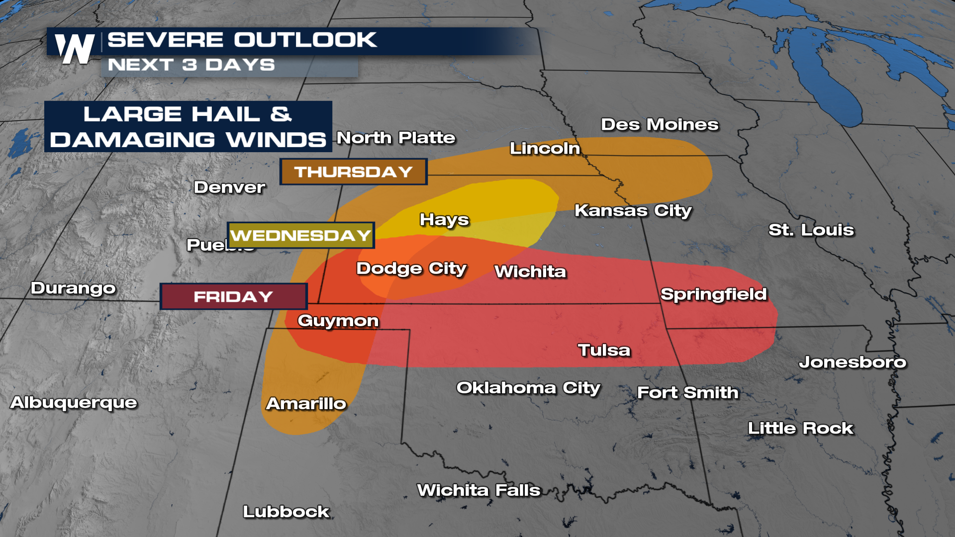 Storms look to fire around the front and move into slightly colder temperatures north of it. The biggest concern right now will be large hail. The Storm Prediction Center is circling portions of Kansas with the highest threat for Wednesday. This outlook expands across Nebreaska, North Texas, and even northern Missouri come Thursday.