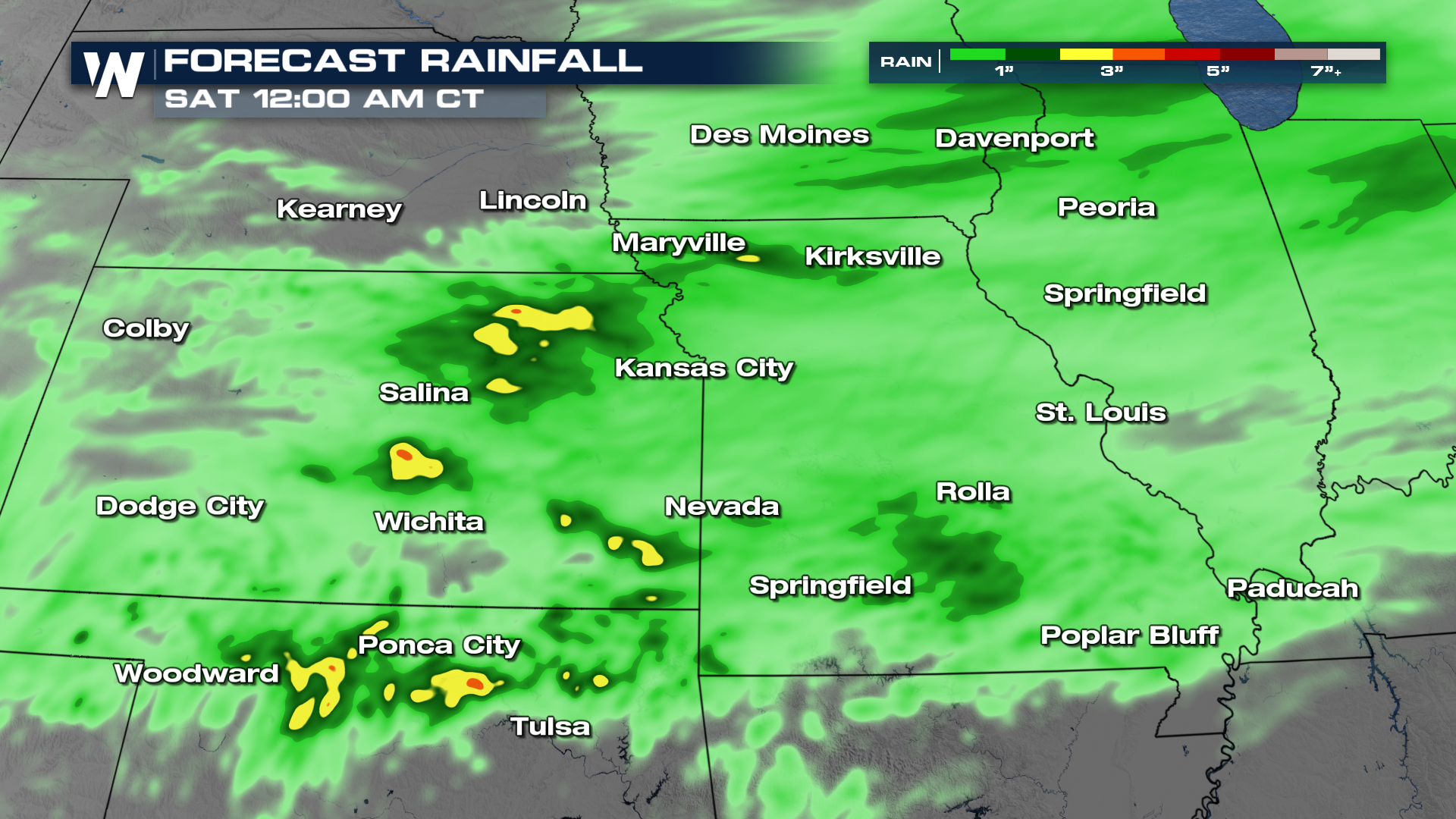 The biggest threat will likely focus on portions of Kansas, Missouri, and surrounding states, where repeated downpours could lead to flooding issues. Rainfall totals are expected to reach a few inches in some areas, with locally higher amounts possible where storms repeatedly pass over the same locations.