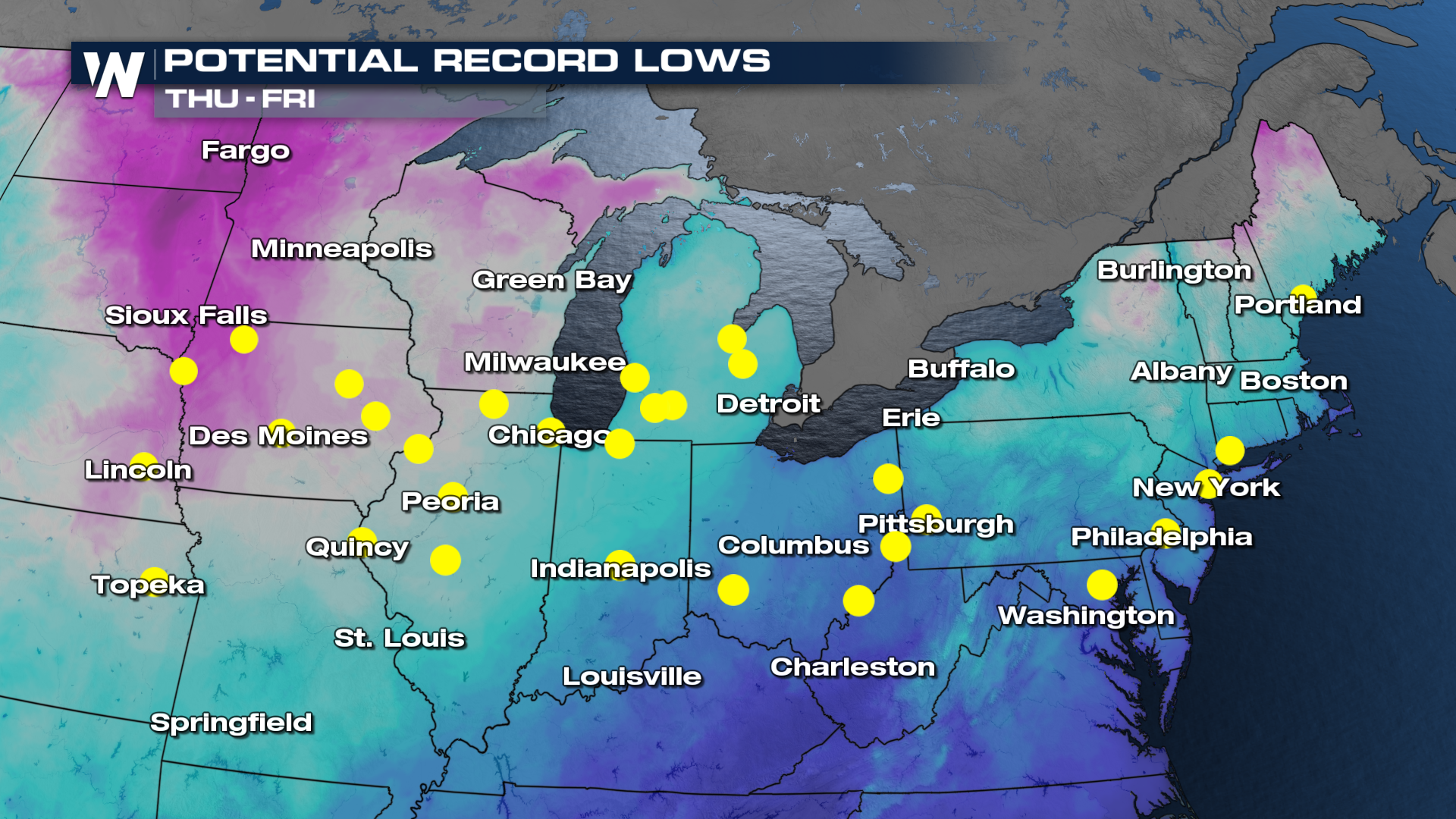 This will likely be good enough to set new record lows late this week. Anywhere in a yellow dot could be looking at a new mark for the day.