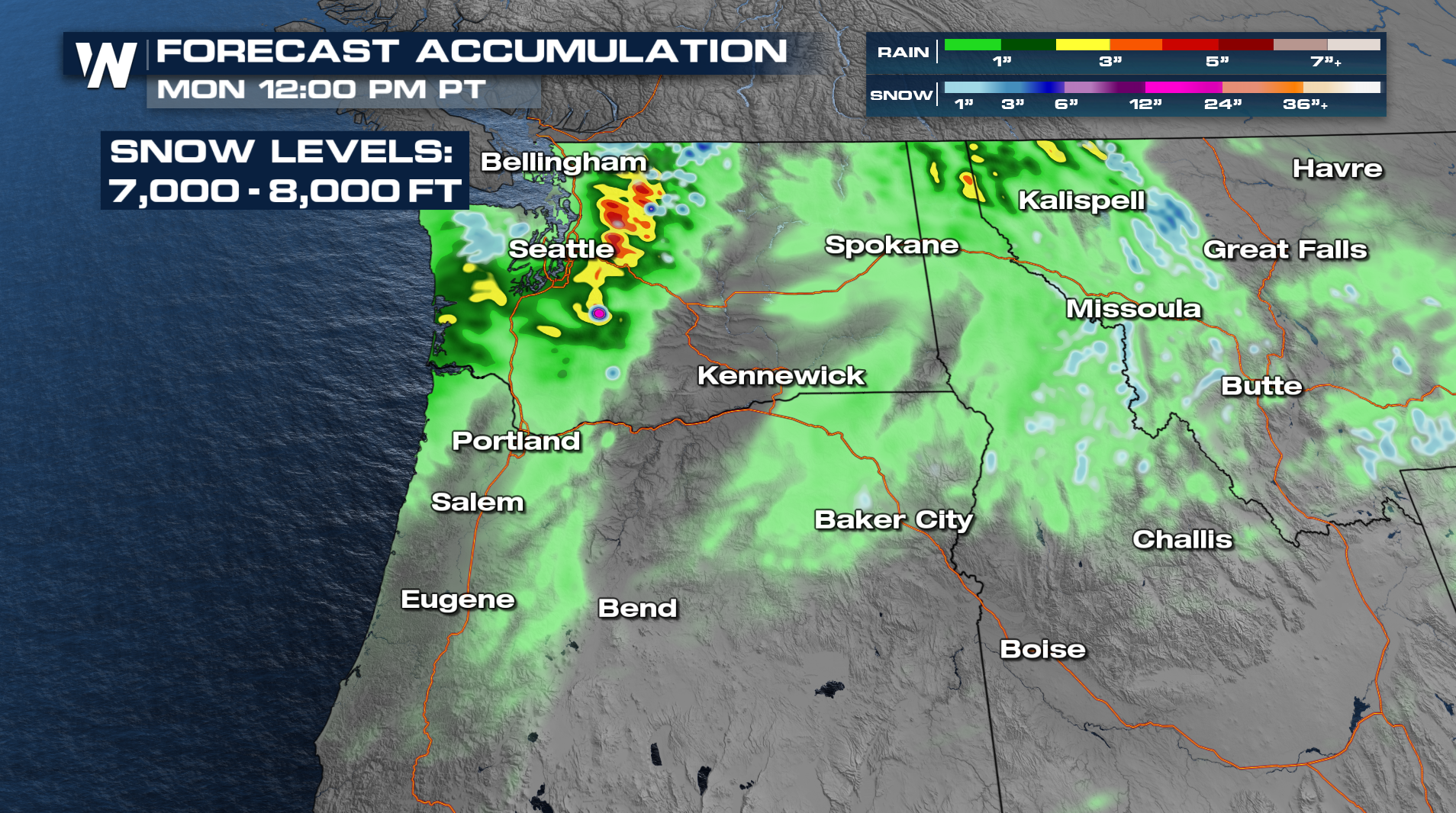 A stubborn area of high pressure is going to sit on top of the West Coast for the remainder of the week. That will help pump more tropical moisture up and over it, focusing it along the Pacific Northwest (above). That will bring rounds of rain, sometimes heavy, to areas surrounding Seattle. Rounds of rain will add up to multiple inches of rainfall, even into the Cascades. Flood watches cover the area until Friday.