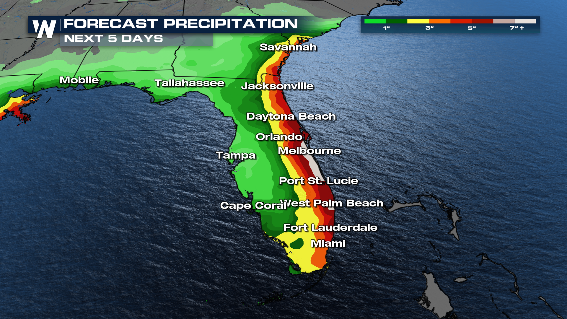This influx of tropical moisture will farm enough energy for these thunderstorms to tap into. As a result, over the next five days, the forecast calls for about 3-5 inches of rain with isolated heavier totals along the Atlantic Coast sea board. Some flooding will be possible with the ground pretty saturated as of late.