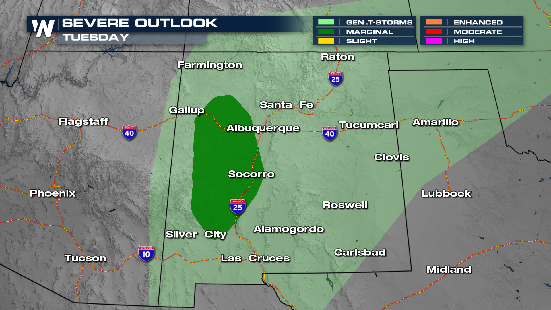 NEW MEXICO - On Tuesday, the Storm Prediction Center issued a MARGINAL (level 1 out of 5) risk for severe thunderstorms across portions of New Mexico, especially in the Gila National Forest. It's a low-end risk due to the more isolated nature of these storms, some of which could bring in some hail.
