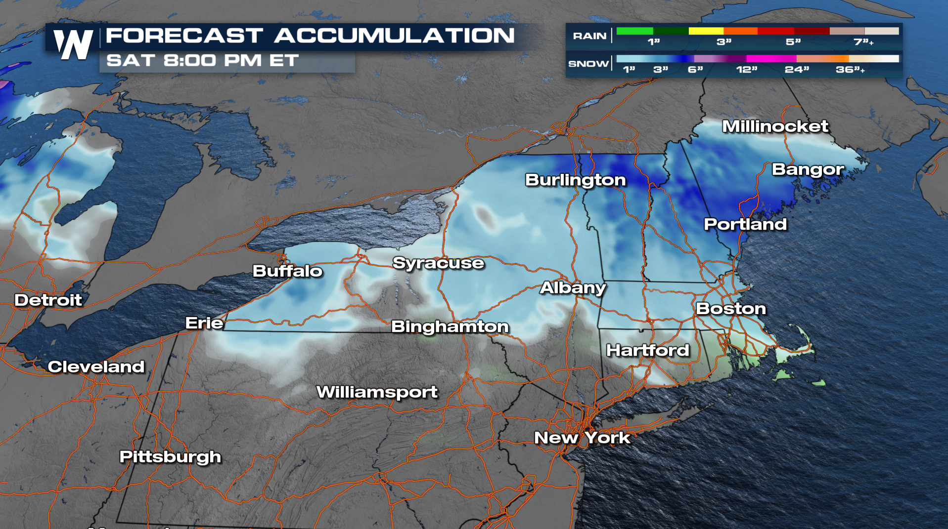 Snow has become more widespread across Upstate New York and into New England today. As trough of low pressure moves through the region into Saturday, more cold air will wrap into the system allowing for more wintry precipitation. Totals are now reaching up to near a foot in parts of Upstate New York.