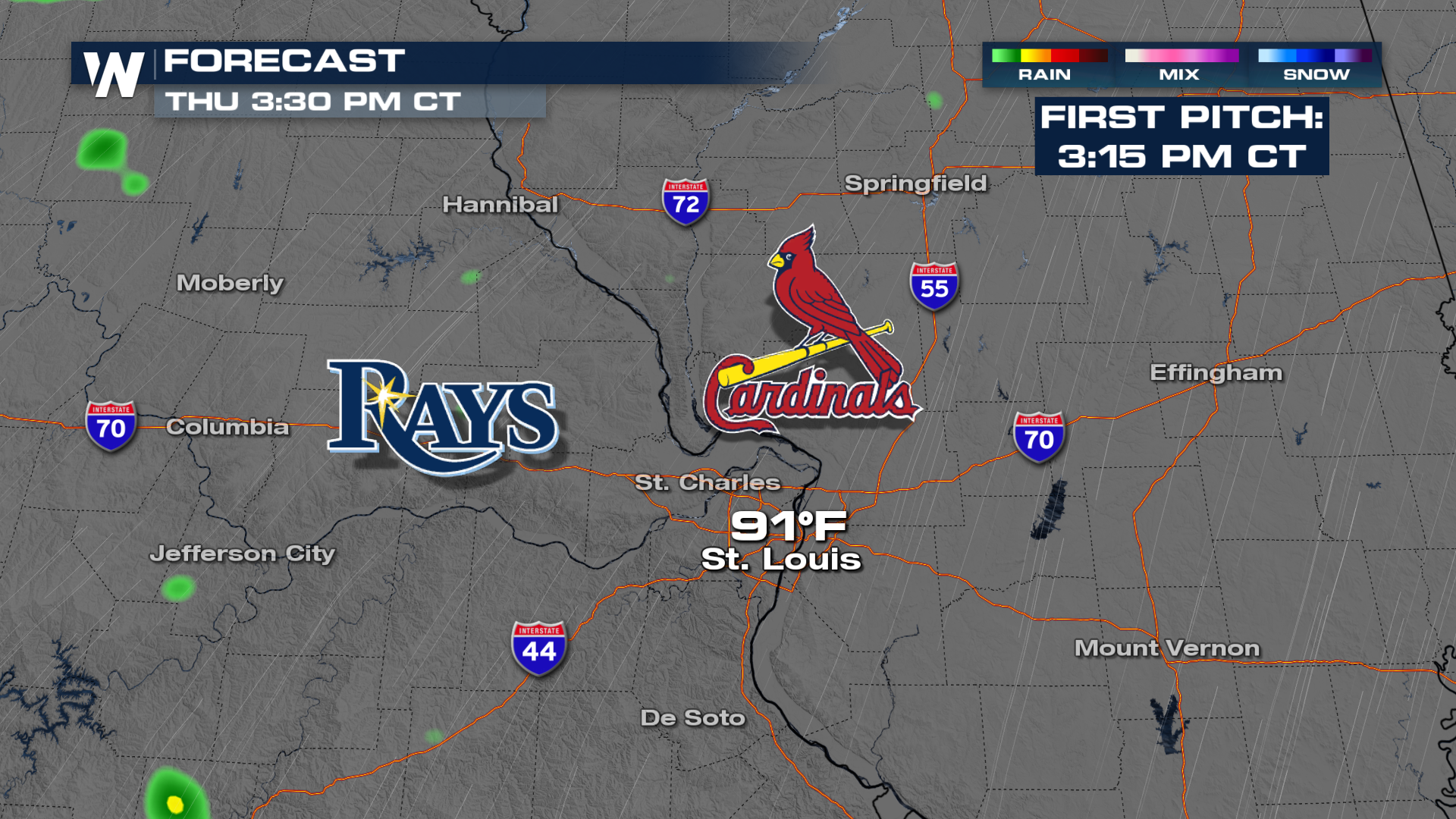 Starting in St. Louis, the threat appears pretty slim at the start. Better bet rainfall might be in the later innings, but a solid chance to get the game in as of right now. It'll be HOT though, with a first pitch around 90!