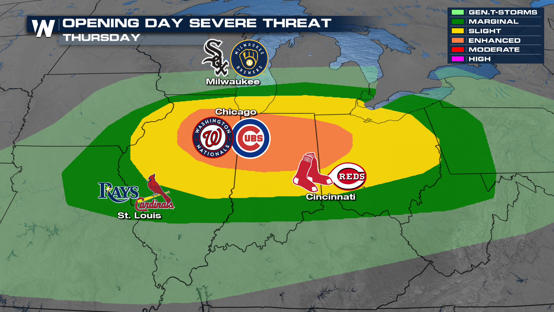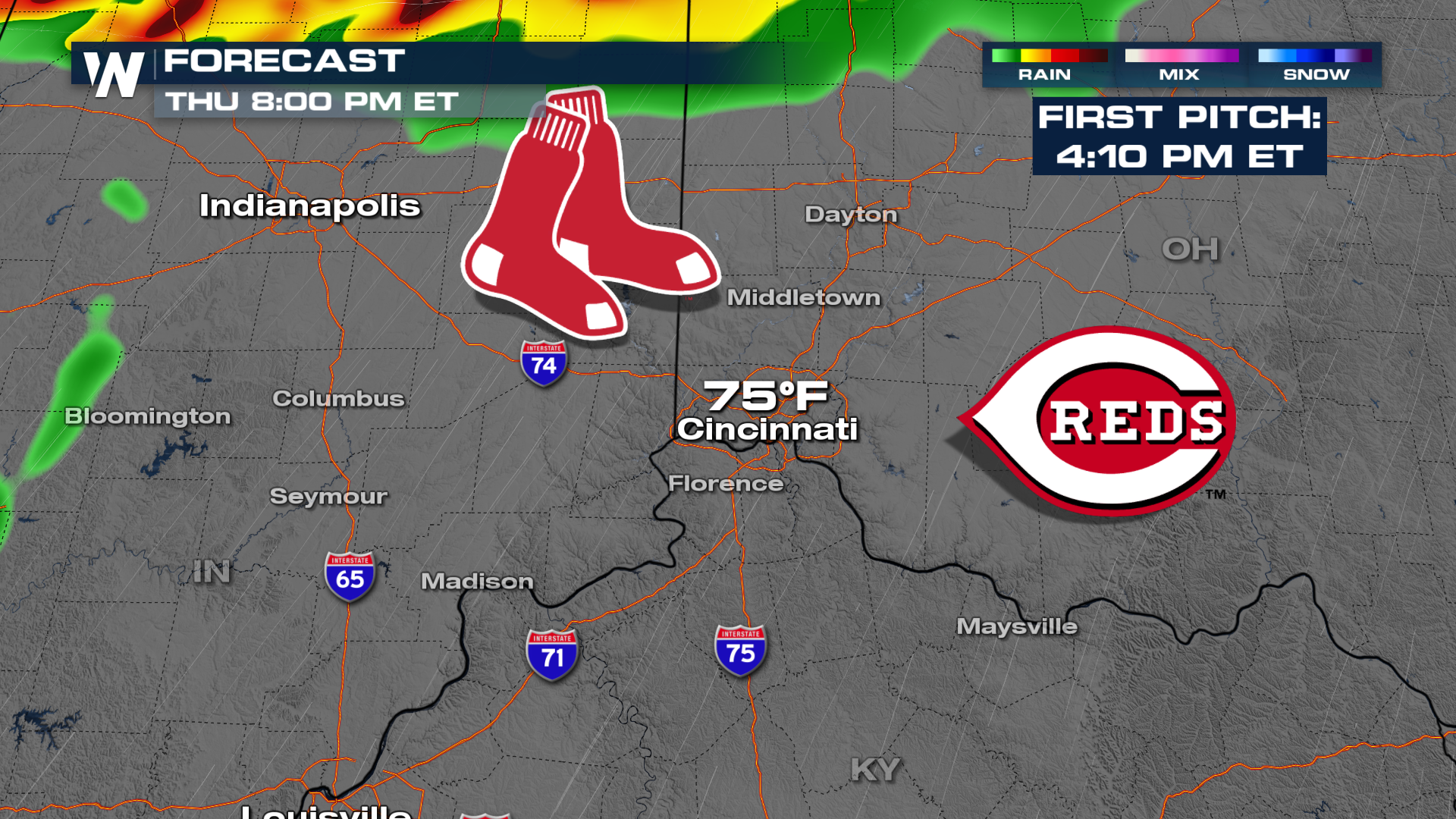 The Reds will host the Red Sox from Boston Thursday and looks like we'll get the game in here as well. Watch out for storms leaving the stadium if you have to travel north, though, by the evening.