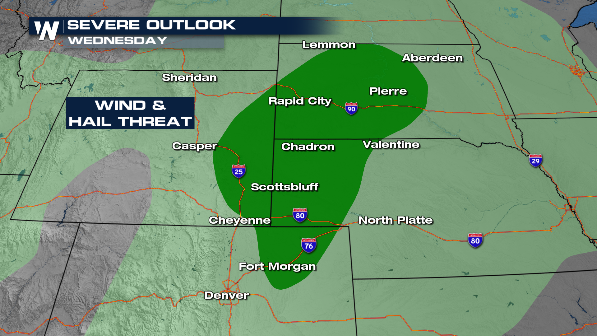 The Storm Prediction Center has issued MARGINAL (level 1 out of 5) risks for both Wednesday and Thursday. On Wednesday, the outlook includes cities such as Rapid City, SD, and Scottsbluff, NE.