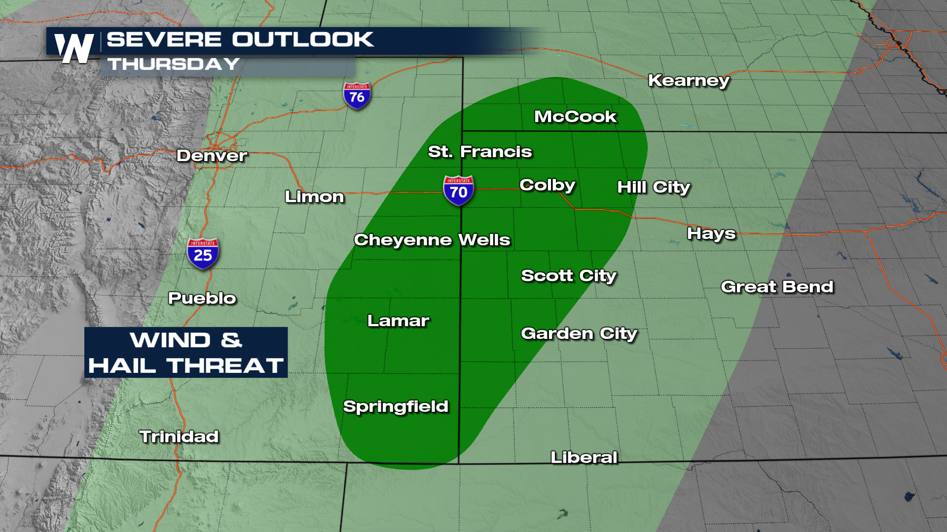 On Thursday, the risk shifts with the cold front down into eastern Colorado and western Kansas. It's also MARGINAL, but includes cities such as Hays, KS, and Lamar, CO.