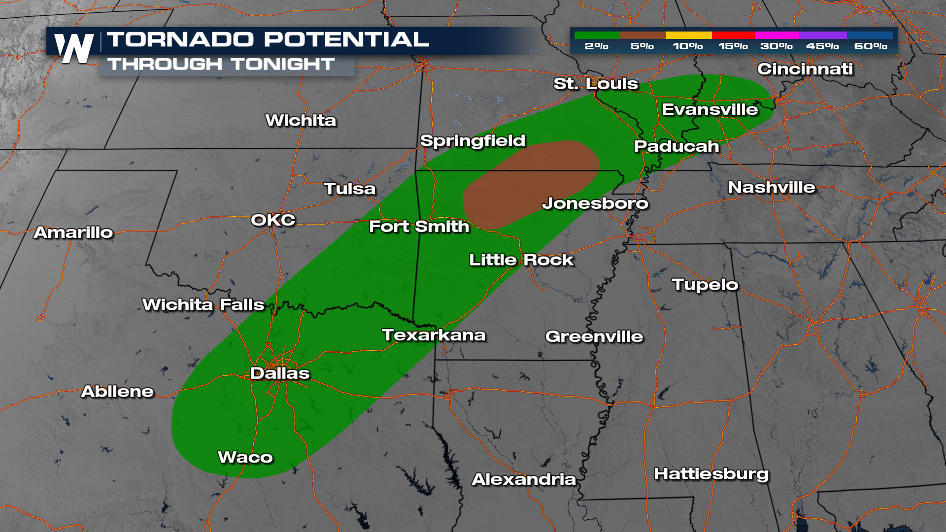 Through tonight, the tornado threat is a little higher in northern Arkansas and into Missouri through the Ozarks.