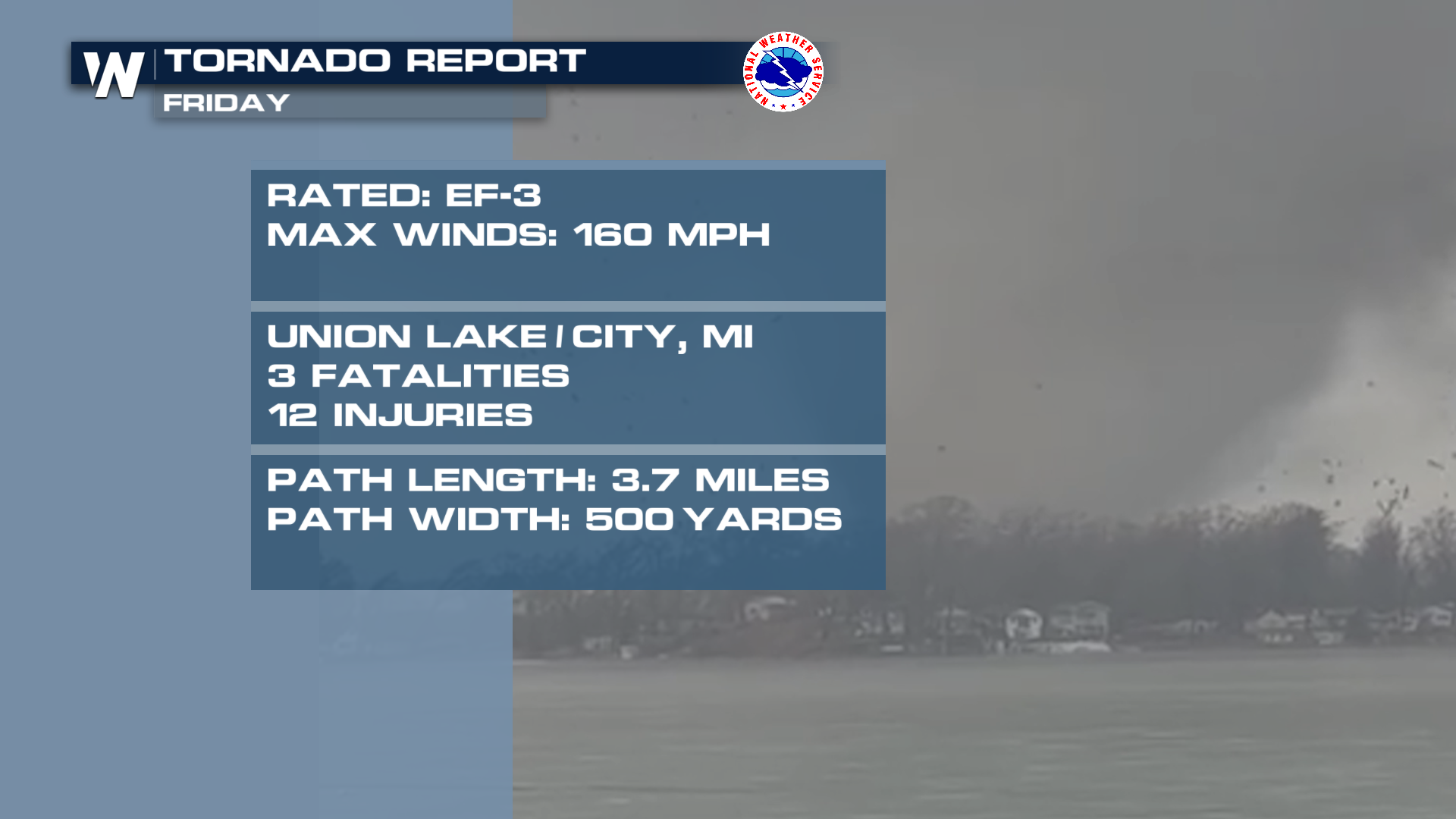 One of the hardest hit areas was southern Michigan, where tornadoes damaged homes and buildings and caused multiple fatalities. Emergency crews responded to widespread damage after storms tore through communities overnight, leaving debris scattered across neighborhoods and knocking out power to thousands. In addition to the tornado threat, storms produced destructive straight-line winds and hail large enough to cause damage to vehicles, roofs and windows. Storm surveyors found EF2 damage in Three Rivers and EF3 damage in Union City, MI.