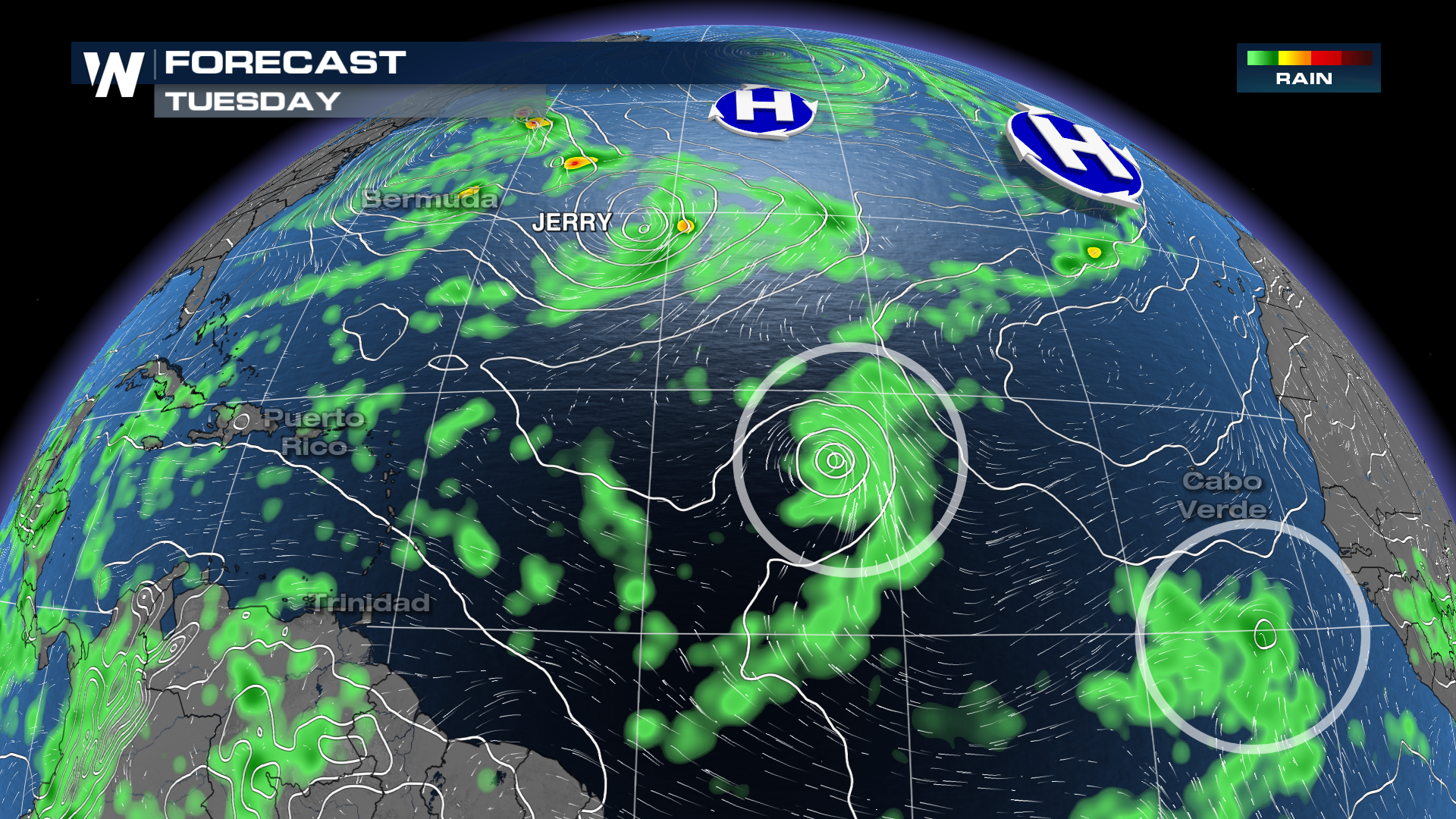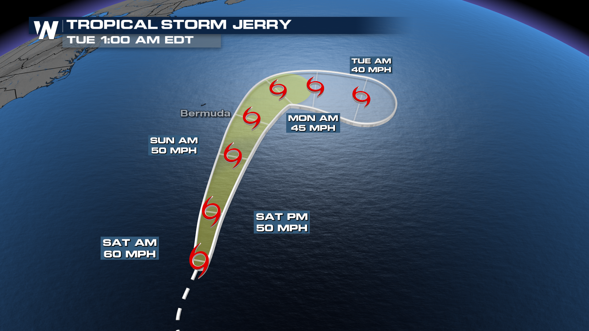 Tropical Storm Jerry had become the 10th named storm of the season last week and brought tropical storm conditions to some of the Leeward Islands. Jerry continues to move to the NNE and is expected to make a right turn near Bermuda in the next few days.