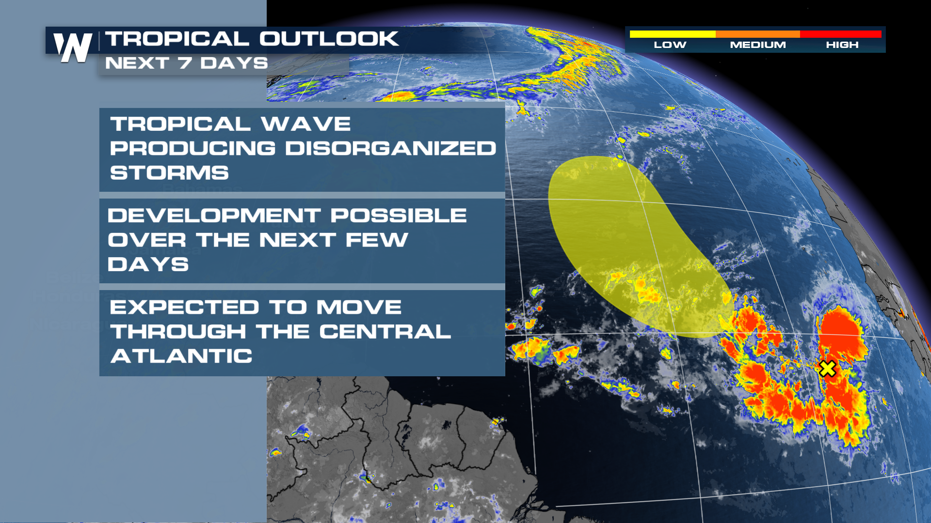 A tropical wave in the eastern Atlantic has a chance to develop this week as it churns into the central Atlantic. This storm is currently expected to stay well out into open waters.