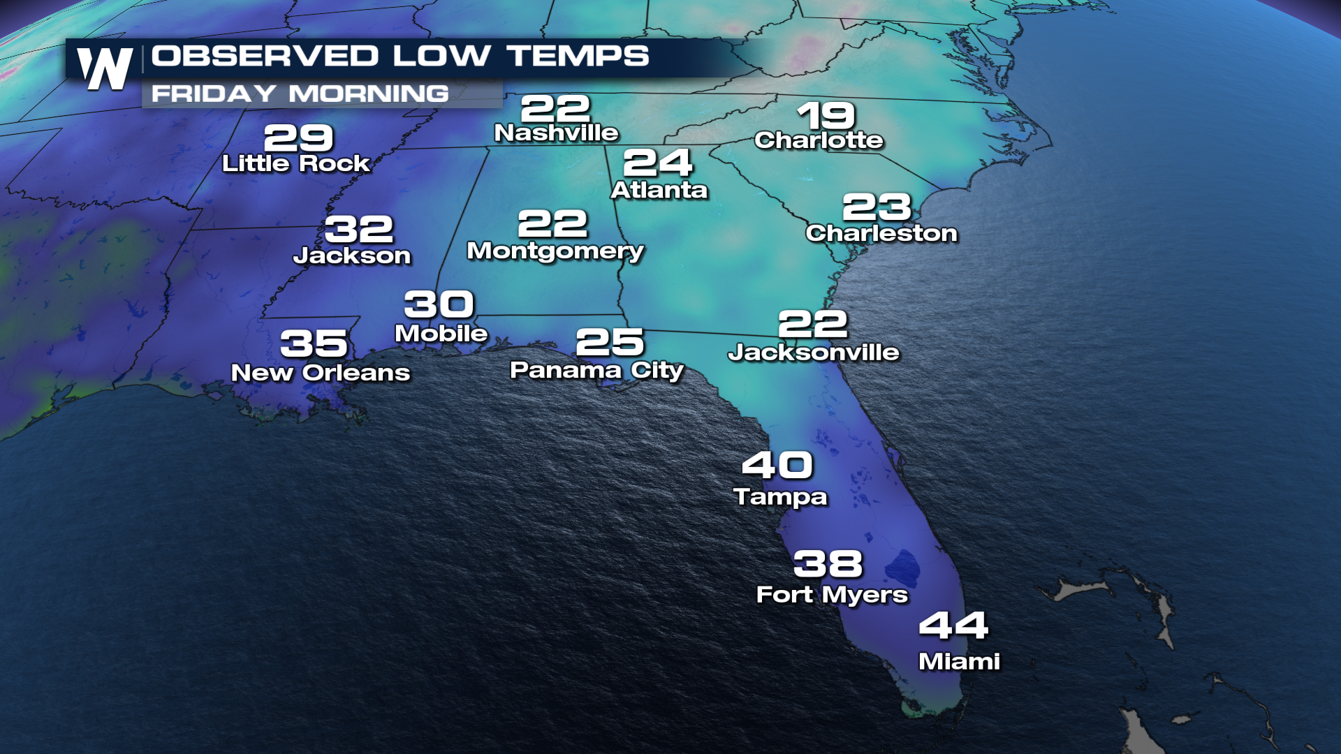 Sub-feezing temperatures made their way into the South and Southeast Thursday into Friday, with lows in the 30s as far south as South Florida! These chilly temps were cold enough to stun cold-blooded Iguanas, which are an invasive species.