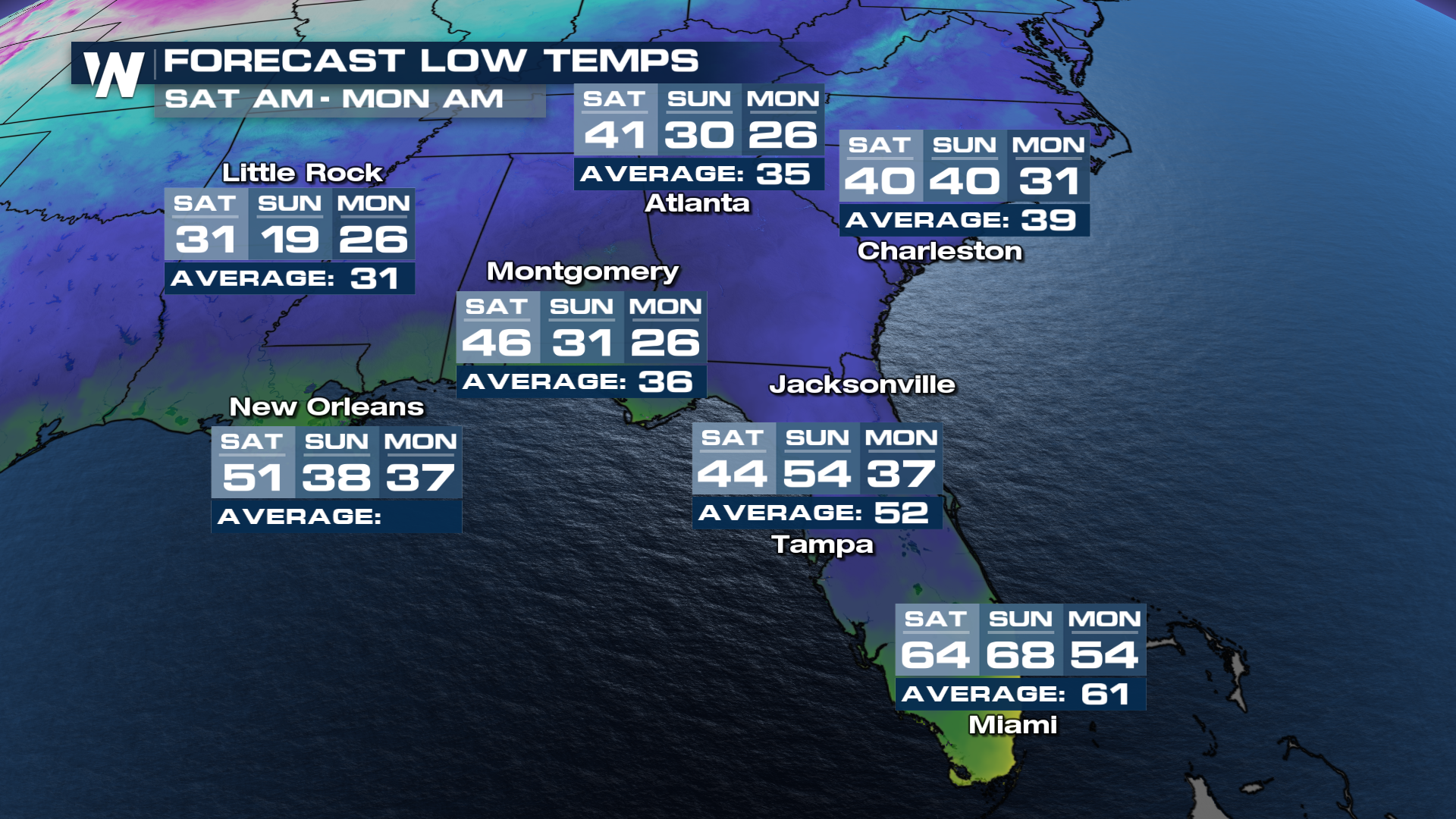 Another blast of arctic air will dive south this weekend, potentially leading to snow falling for a few areas of the South Sunday (click here to read more). While few people will see measurable snow, everyone in the Southeast will see below average temperatures return Sunday into Monday.