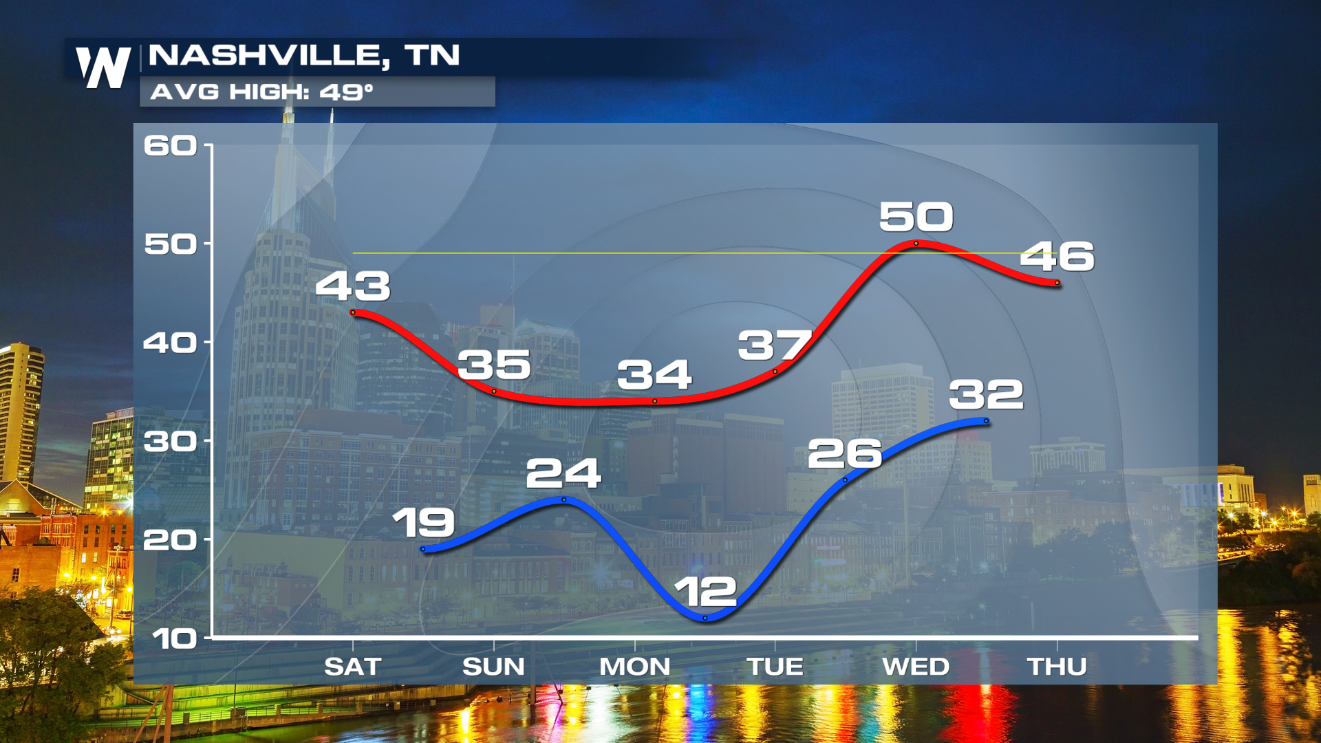 As we look at the 7-day temperature plot for Nashville, daytime highs are expected to stay below normal for several days. The nighttime temperatures will drop into the deep freezer with values in the low 10s.