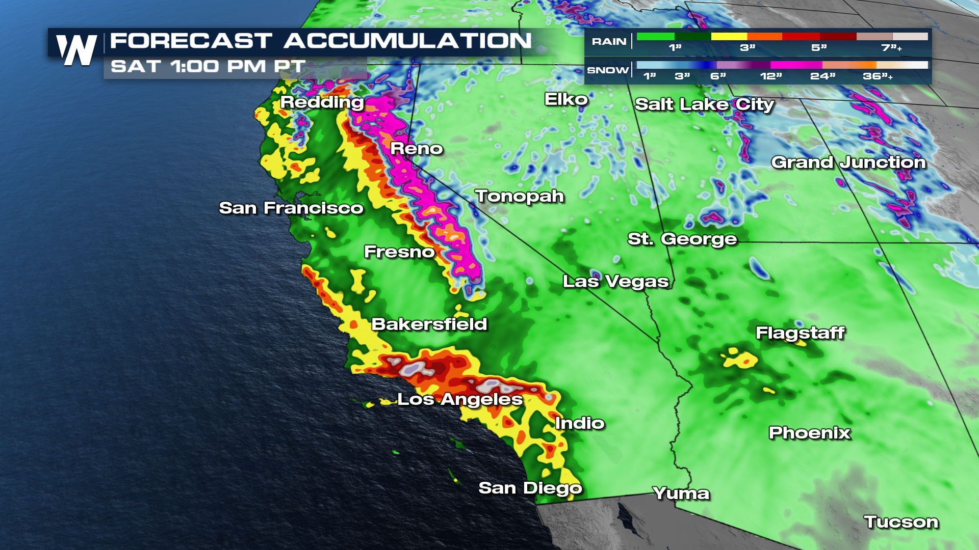 Models indicate over a foot of snow for the higher elevations of the Sierra Nevada Mountains, with several inches of rainfall possible for Southern California. Just one week ago, Southern California saw major flooding. These areas will be more susceptible to additional flooding with the recently saturated soils.