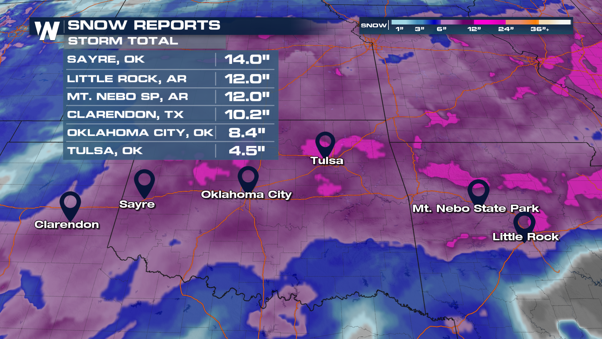 Snow started Friday in the South before switching over to sleet and ice on Saturday with our first round of precipitation. Our top snowfall totals maxed out around a foot for cities such as Little Rock, Arkansas.