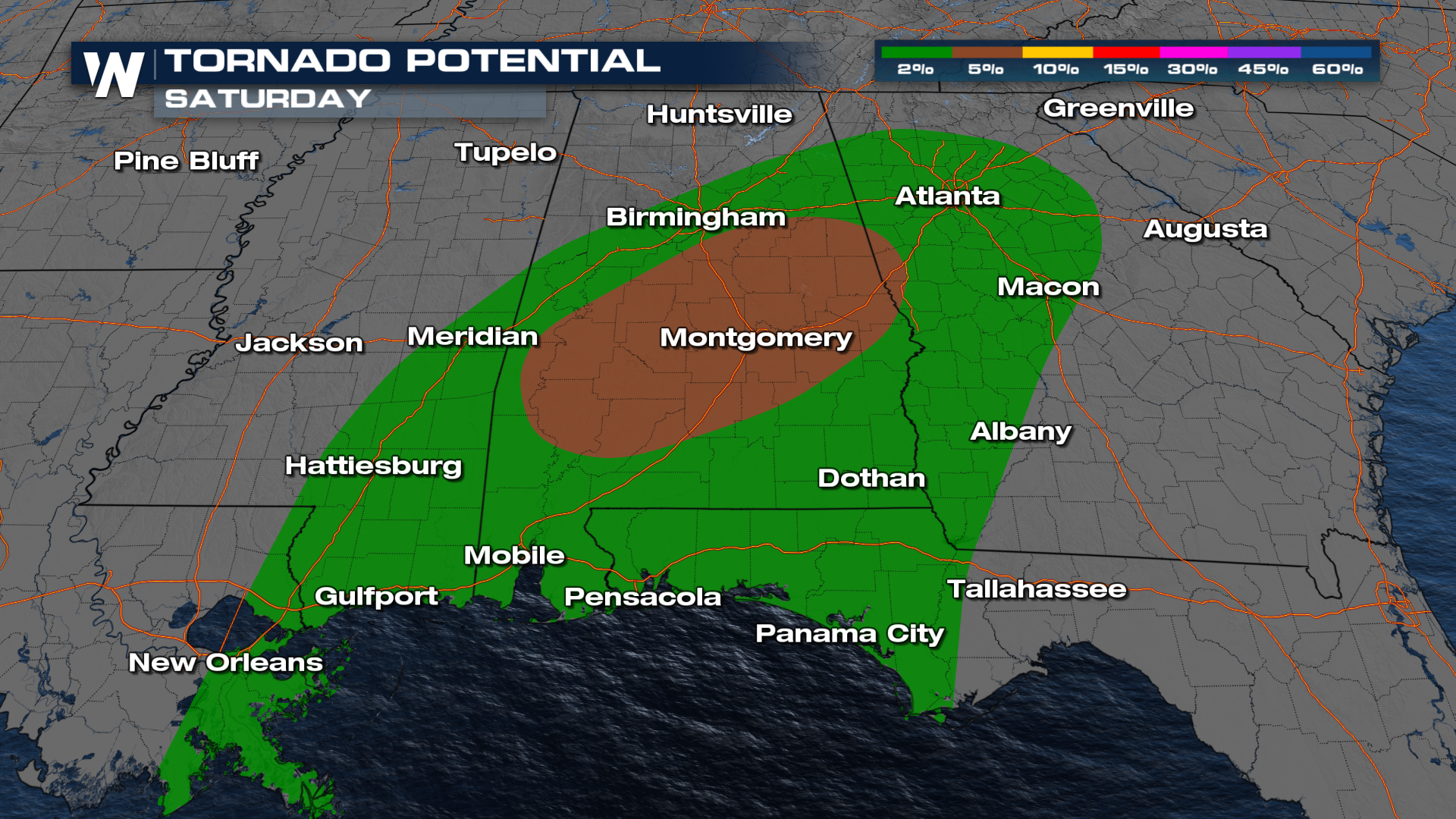 Severe storms will remain possible through Saturday afternoon, including the continued threat for tornadoes. The tornado threat for Saturday stretches from New Orleans through Atlanta.