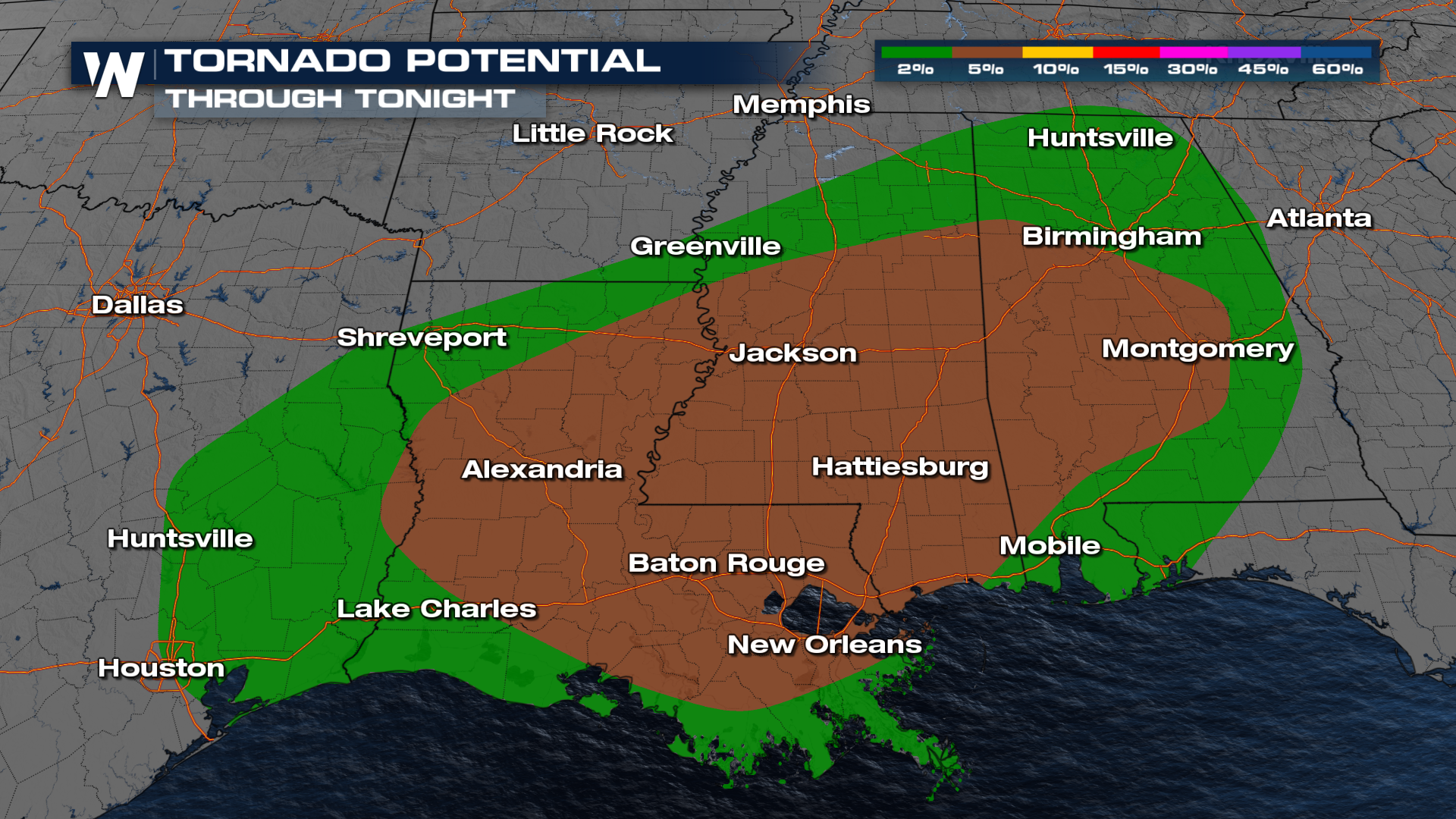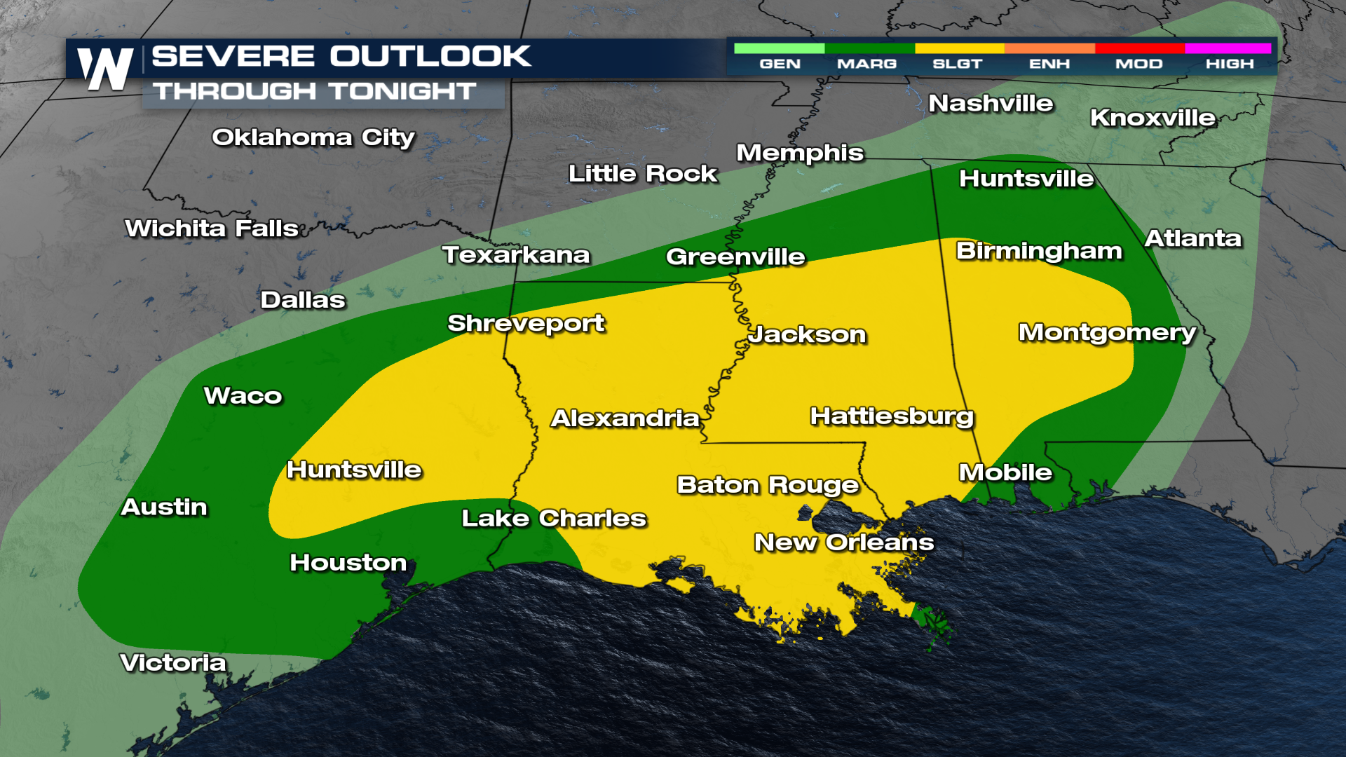 This evening's outlook covers areas from east Texas through Alabama, with a level 2 (slight) risk from Huntsville, TX to Montgomery, AL, meaning storms are expected to be slightly more widespread, stronger, and could last longer. All modes of severe weather (wind, hail, and tornadoes) will be possible. The tornado potential is at a level 2 from Louisiana through central Alabama