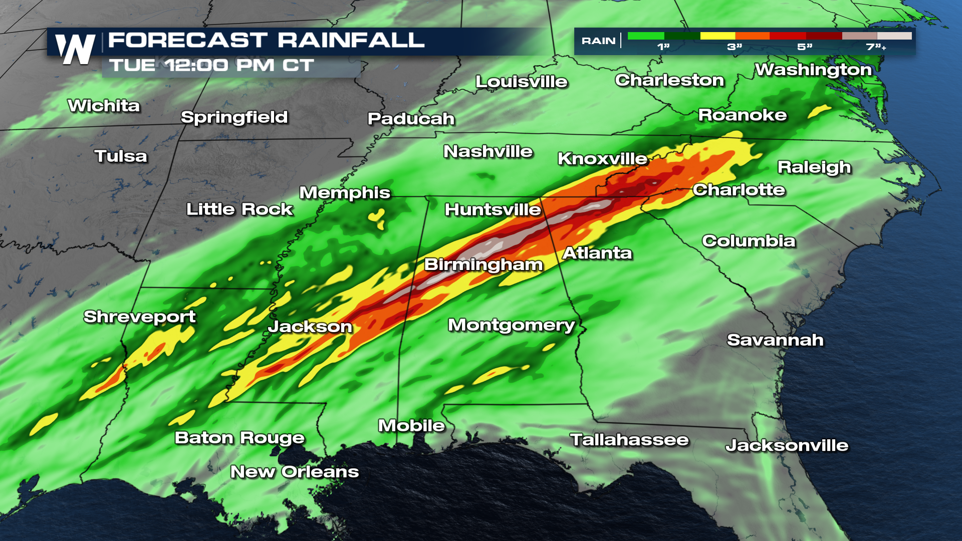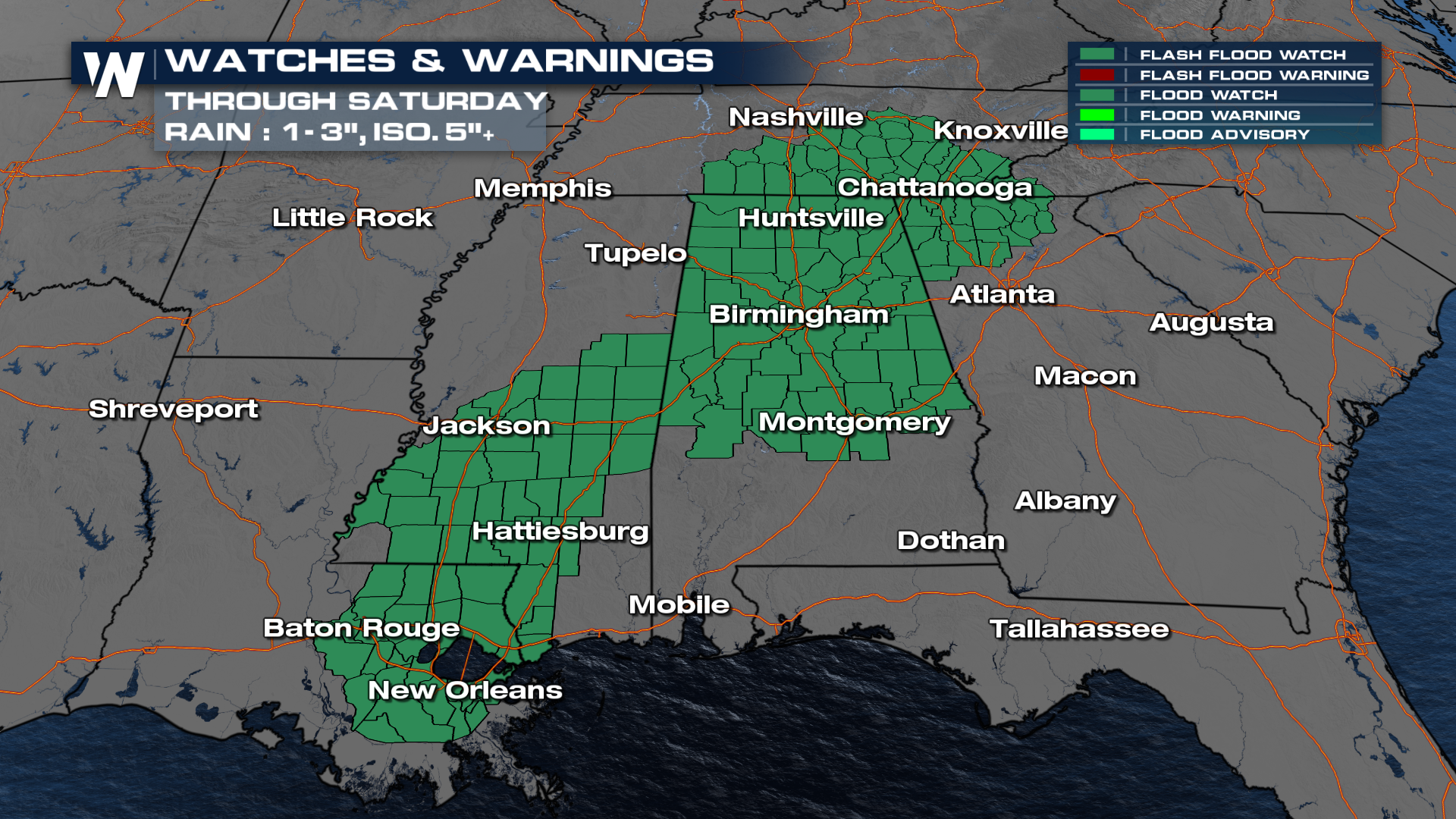 Rainfall rates are increasing significantly this evening across the south, with 1-2" per hour possible, possibly more. This means some areas could receive 4-6 inches in a short period of time, leading to a flash flooding potential. A Flood Watch remains in place for portions of the South through Saturday.
