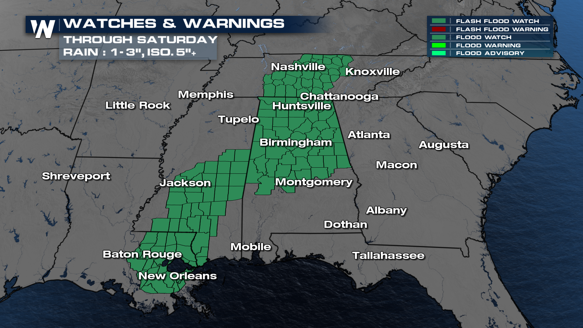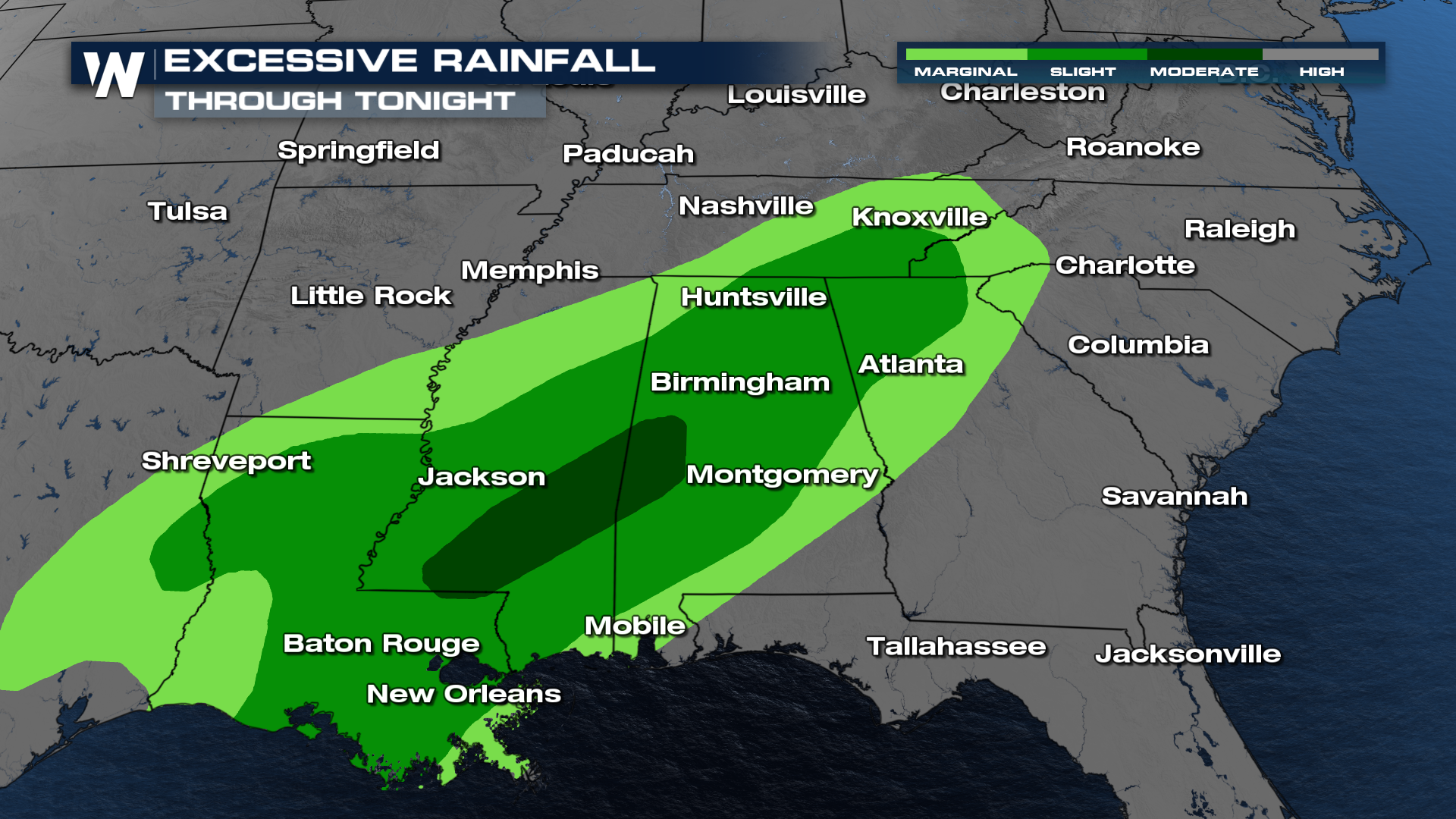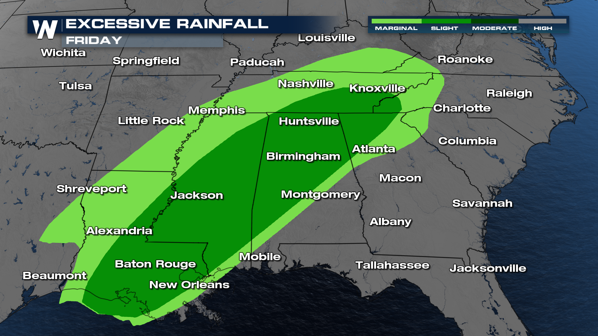The WPC has issued a level 2 outlook for excessive rainfall (flash flooding) for Friday, with areas from Middle/East Tennessee into northern Alabama and Mississippi mostly likely to see flooding develop. If you live in a flood-prone location, review your flooding plan to seek higher ground if flood waters threaten.