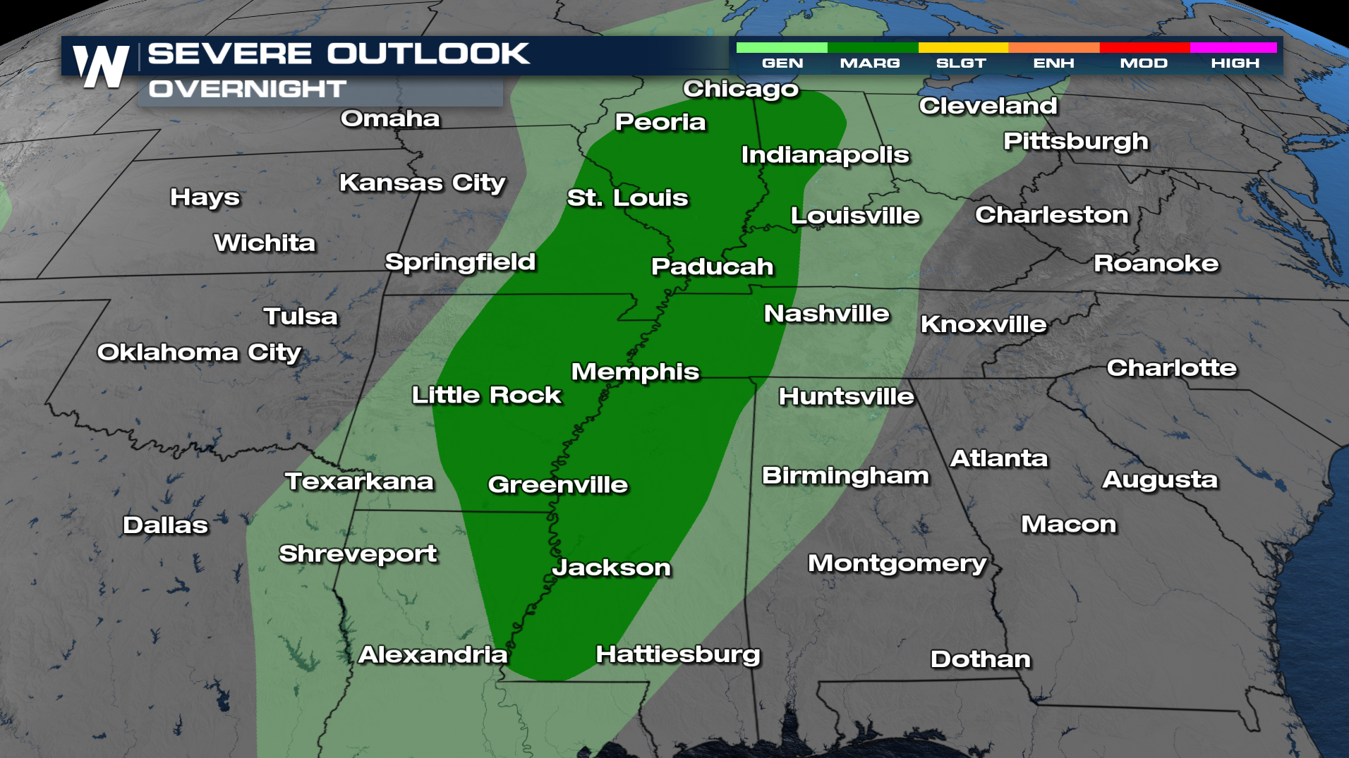 Friday, a second storm system is expected to reinforce the unsettled pattern. Friday's outlook covers areas from east Texas through Kentucky, with a level 2 (slight) risk from Baton Rouge to Nashville, which means storms are expected to be slightly more widespread, stronger, and could last longer. All modes of severe weather (wind, hail, and tornadoes) will be possible.