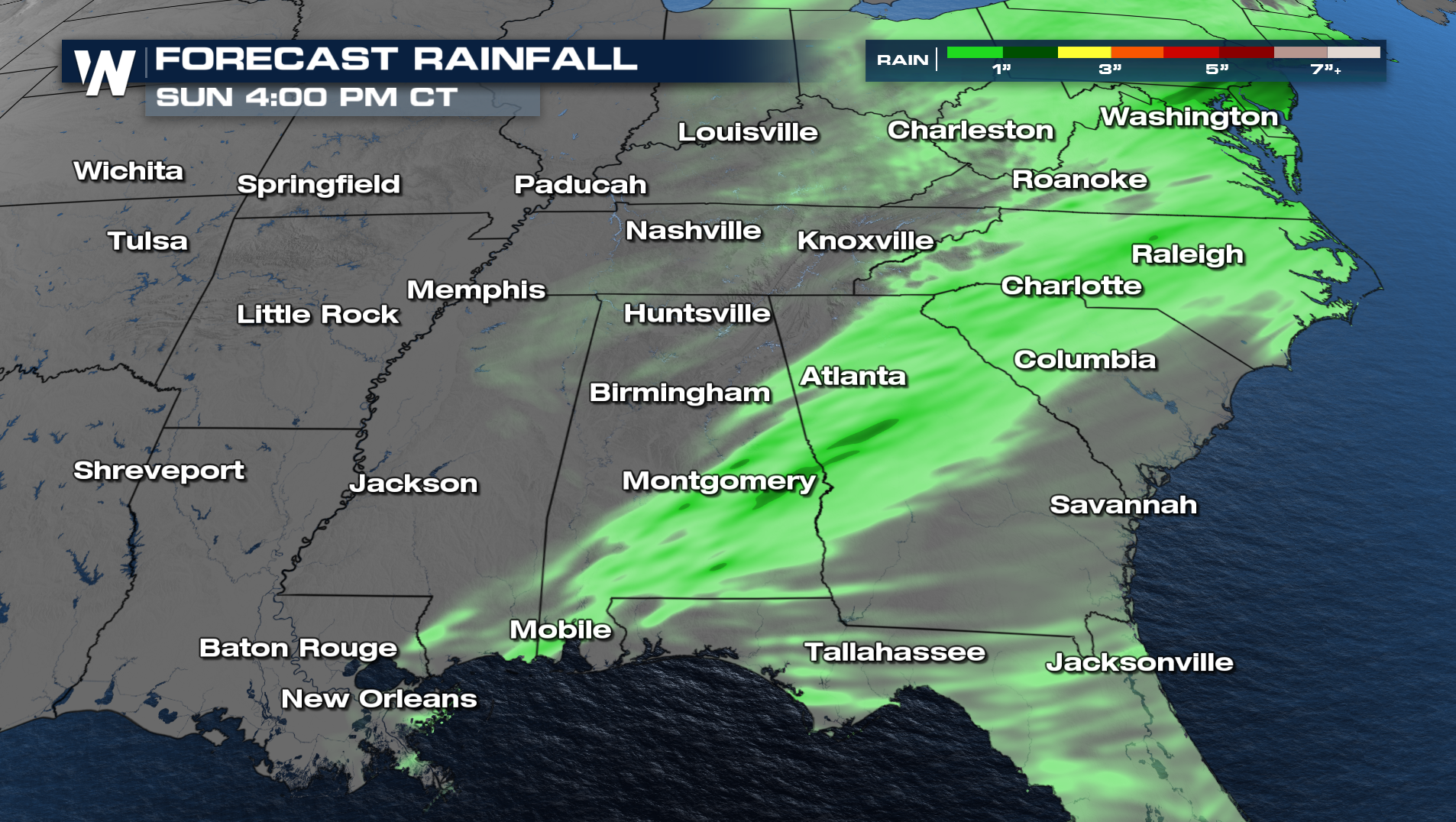 Throughout the rest of the afternoon and evening hours, the showers and few embedded storms will continue to work their way east towards the Atlantic coast. The forecast will be drier and windier for Sunday across the South. It is possible the remaining storms could produced an additional half an inch to an inch of rain. The Flood Watch across Alabama and Georgia will expire later this afternoon.