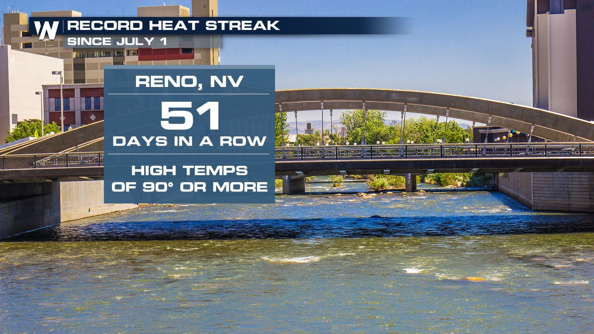 This summer has certainly been a hot one in Reno, Nevada. Since July 1st, the "Biggest Little City in the World" has experienced high temperatures of 90 degrees or more for 51 consecutive days! This ties the record streak of 90 degree days set between June 16th and August 5th in 2017. Looking at the forecast, this year's record streak will likely continue. High temperatures are expected to top out in the lower 90s through the rest of the week.