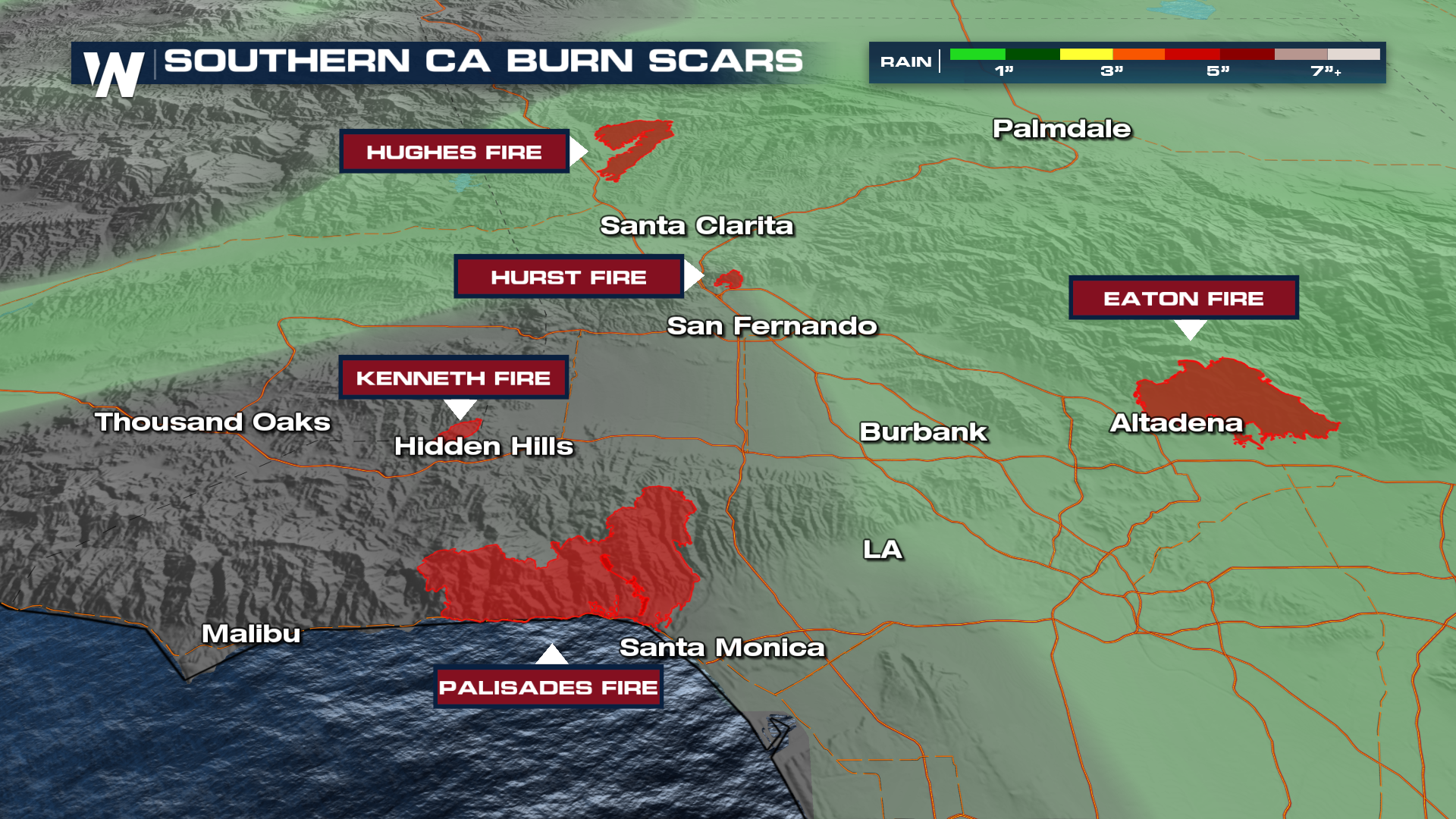 As of Wednesday, all evacuation orders have been lifted for Los Angeles after torrential rain fell over burned areas. The warnings were issued for areas with burn scars from earlier fires, like the Palisades, Hurst, and Sunset fire zones, due to the threat of mud and debris flows. Heavy rainfall, snow, and gusty winds continue to calm down for the southern half of the Golden State as a strong trough continues to move to the northeast.