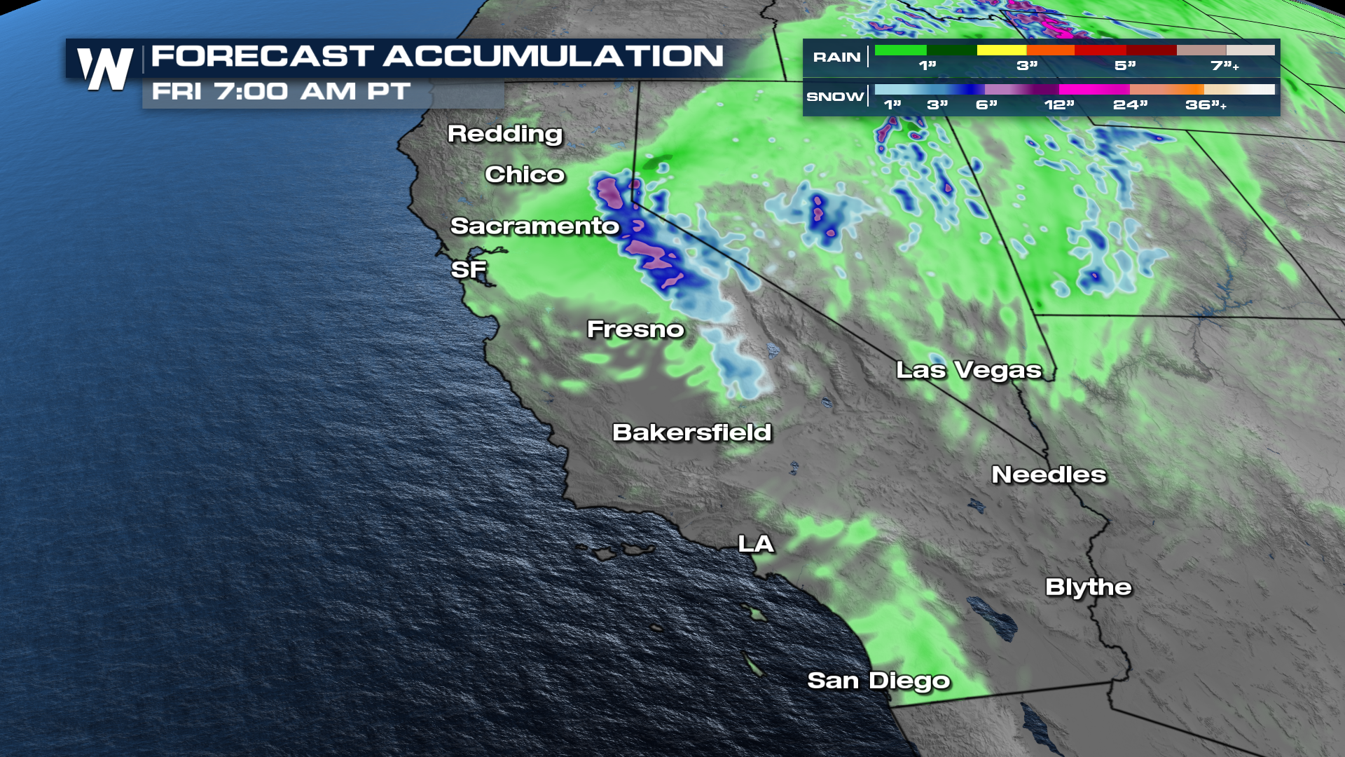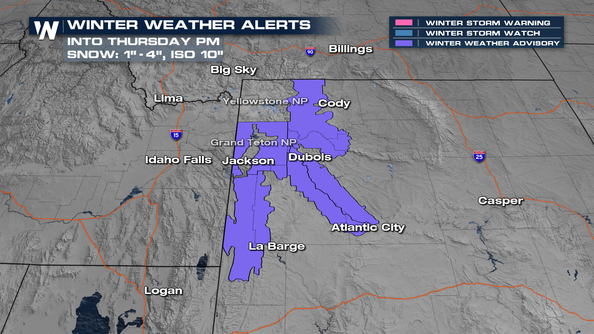 Winter Storm Warnings (Pink) and Winter Weather Advisories (Purple) have now been dropped for the Sierra Nevada Range but more winter alerts have been issued for areas like Jackson, WY as this system lifts to the NE.