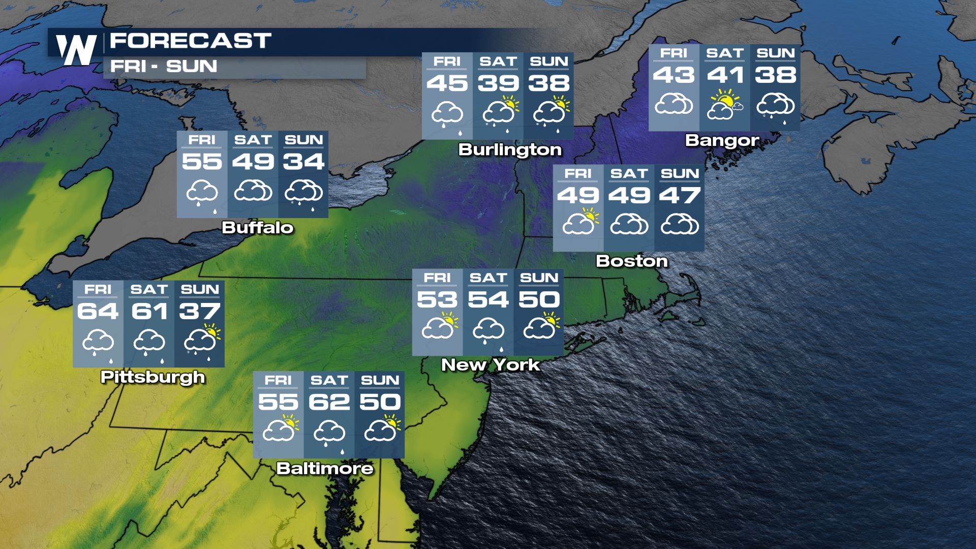 The first low-pressure system will be accompanied by near-record warmth, leading to mostly rain falling on Friday. By Saturday, colder air returns to the I-90 corridor to allow higher elevations to see a mix of ice and sleet, with lower elevation rain. Heading into Sunday, much cooler air develops in Northwesterly flow to allow for light snow to fall, though it looks to mostly impact areas closer to the Great Lakes versus the I-95 corridor. There's still lots of time for this forecast to change - so check back in with us!