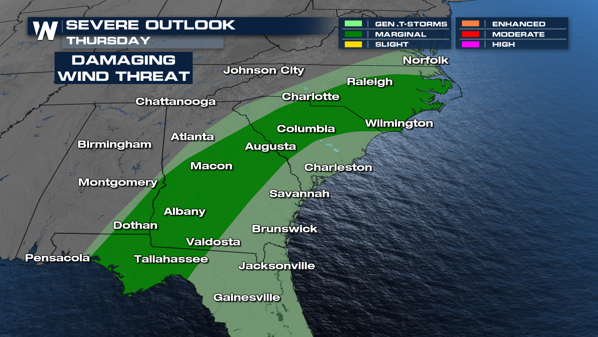 The threat for severe weather continues Thursday morning as the squall line moves through the Carolinas and Georgia. The biggest threat will be damaging winds.