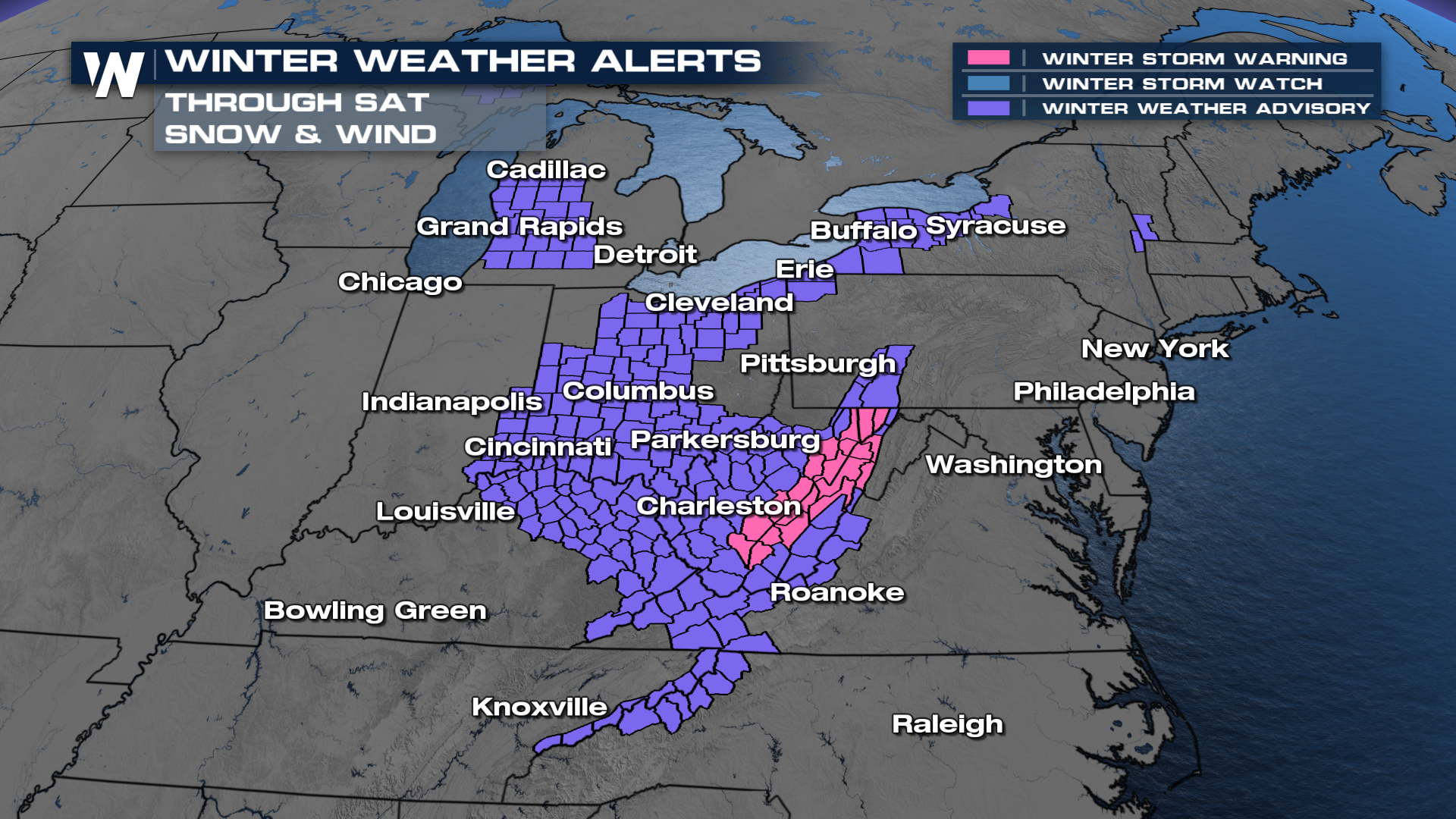 Winter weather advisories have been issued from Vermont to North Carolina for snow and wind, resulting in impacts to travel. Heavy blowing snow is expected over the spine of the Appalachians and Alleghenies, prompting the upgrade to a winter storm warning.