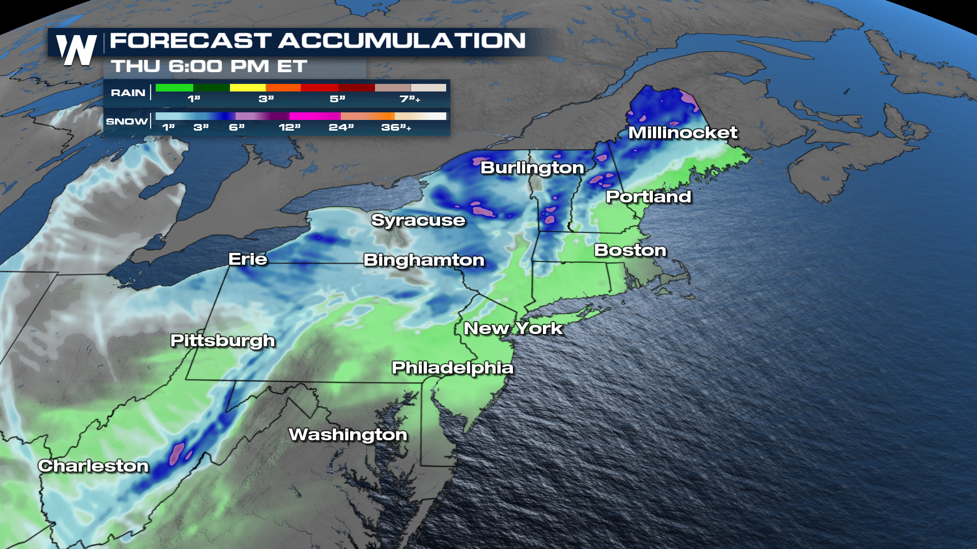 NORTHEAST - The northeastern U.S. is in for some wintry weather over the course of the week, with a couple of clipper systems dropping down from the northern Plains. The clippers continue with a fast-moving clipper system that will move out of the Upper Midwest and into the interior of the Northeast on Wednesday. This system will bring a brief but disruptive round of winter weather to several states. As the system pushes east, a wide swath of Winter Weather Advisories and Warnings is issued across the Interior Northeast and the higher elevations of the Appalachians. Snowfall totals across this region will range from 4 to 6 inches.