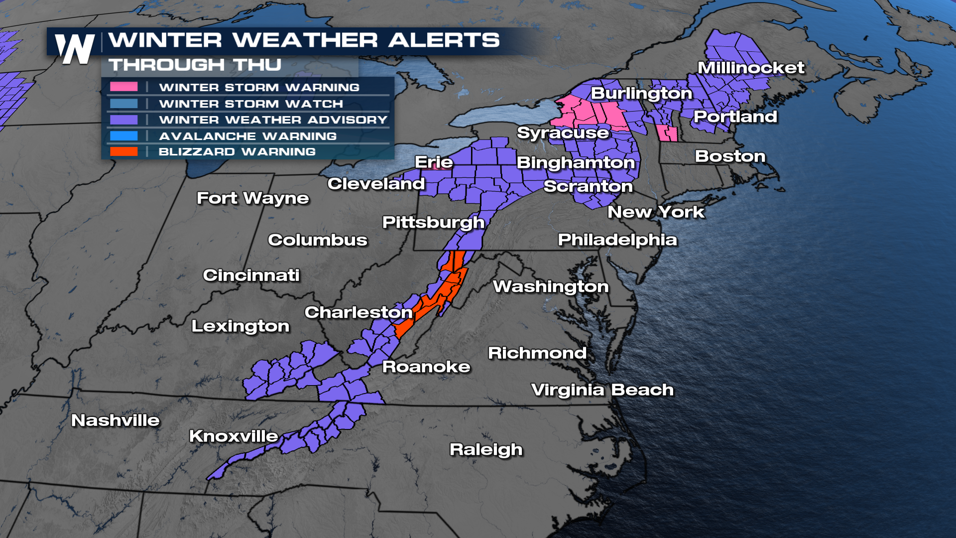 One of the most significant impacts will come from a corridor of Blizzard Warnings in the Central Appalachians. In this region, snow accumulations of three to six inches combined with wind gusts up to 50 miles per hour will create dangerous whiteout conditions and severely reduced visibility. Travel will be extremely difficult to nearly impossible at times, as blowing snow-coated roads and obscured sight lines will be possible.