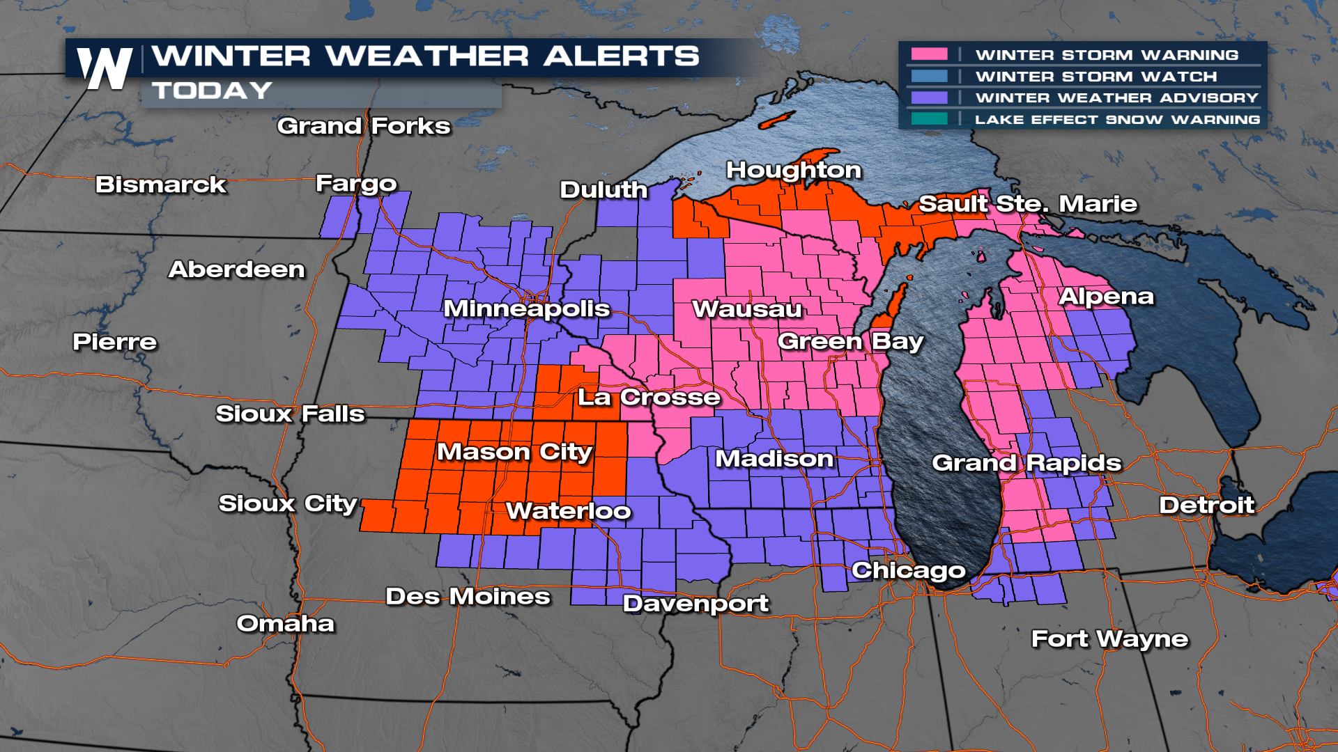 UPPER MIDWEST - Blizzard alerts are in place for portions of the Upper Midwest through Monday. Blizzard warnings are issued when visibility is less than 1/4 mile, winds are greater than 35 mph, and lasting for more than 3 hours. Additional alerts are in place, including winter storm warnings and winter weather advisories. 4 - 14" of snow will be possible and white out conditions will stick around long after the snow stops falling.