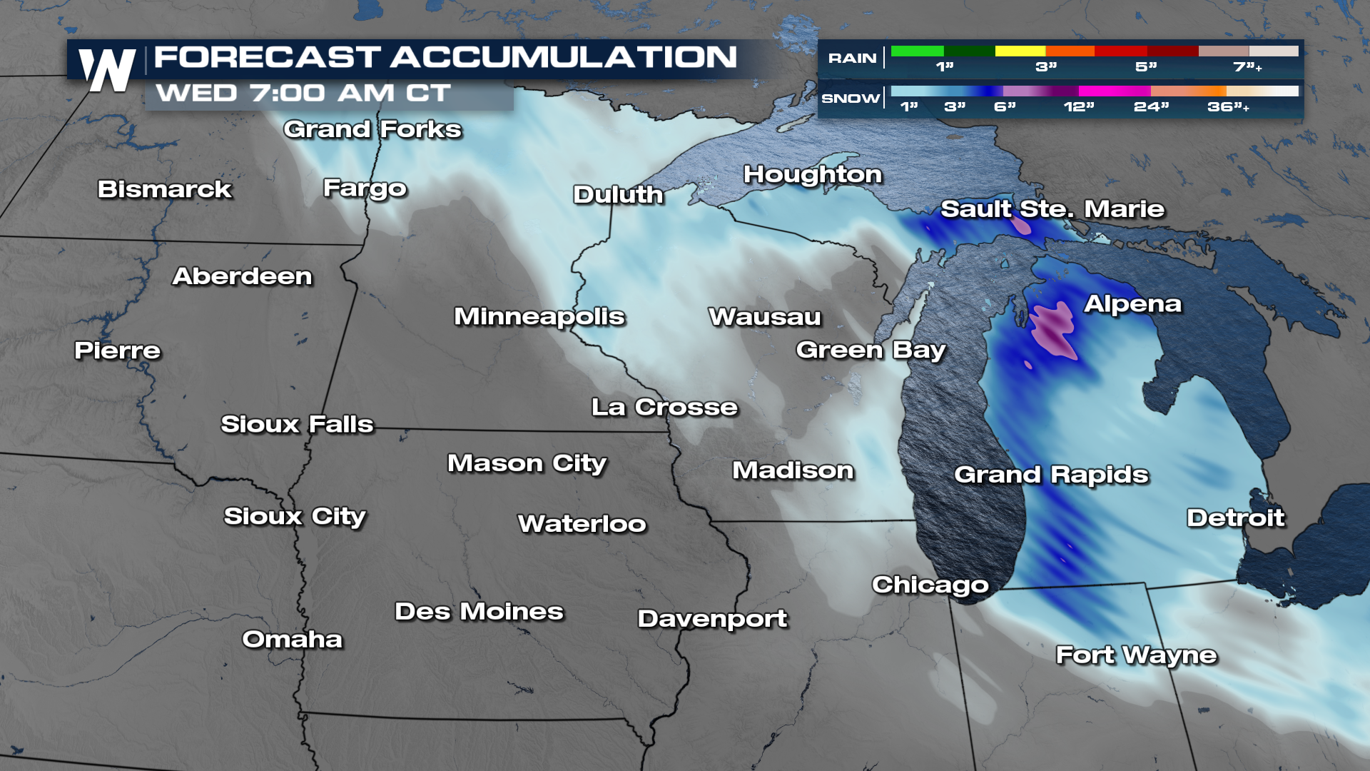 Snowfall totals could reach several inches, especially with the added influence of lake-effect bands near Lake Superior.