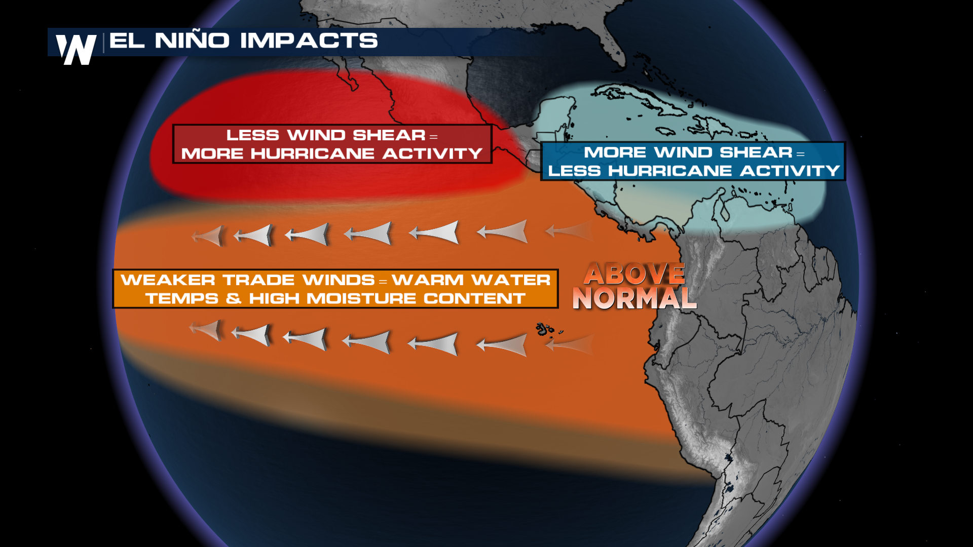 Why do El Niños typically reduce hurricane activity in the Atlantic Basin? The warmer water in the equatorial pacific often leads to a more energetic sub-tropical jet, leading to stronger winds in the upper-atmosphere over the Caribbean. Surface winds in the Caribbean most often comes from the east, known as the trade winds. When these winds lay under strong winds from the opposite (or even the same direction), it leads to strong wind shear which tears hurricanes apart.