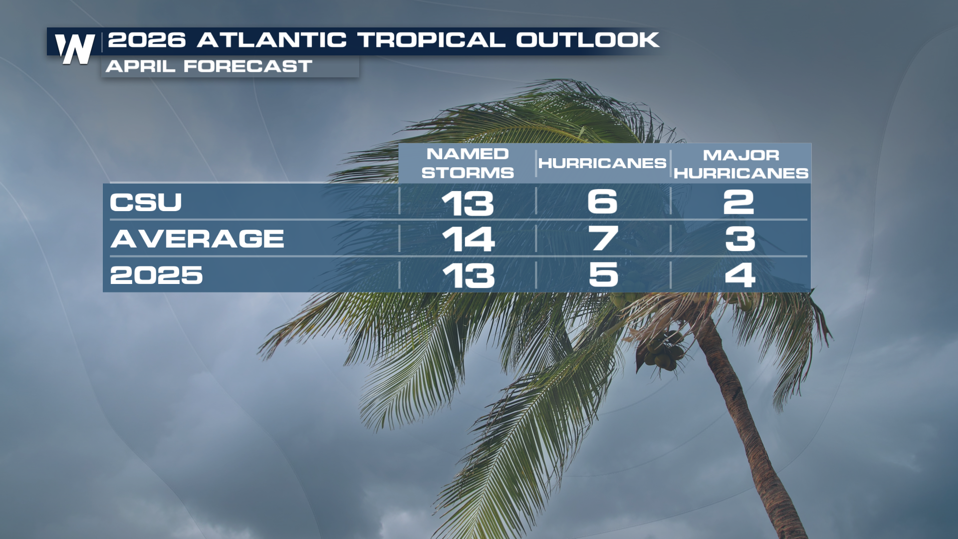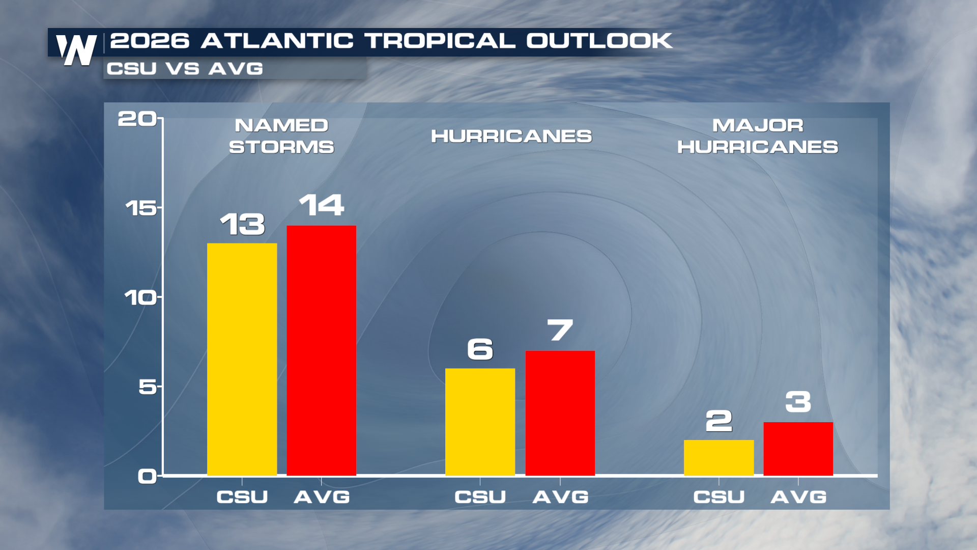 CSU just released their first forecast for 2026, which is calling for a near normal to slightly below average season with 13 named storms, 6 hurricanes, and 2 major hurricanes. The average season in the Atlantic is just slightly higher than this initial prediction, meaning several impactful storms are still possible. As a reminder, even below average seasons can have major impacts depending on where storms form which is impossible to predict months ahead of time.