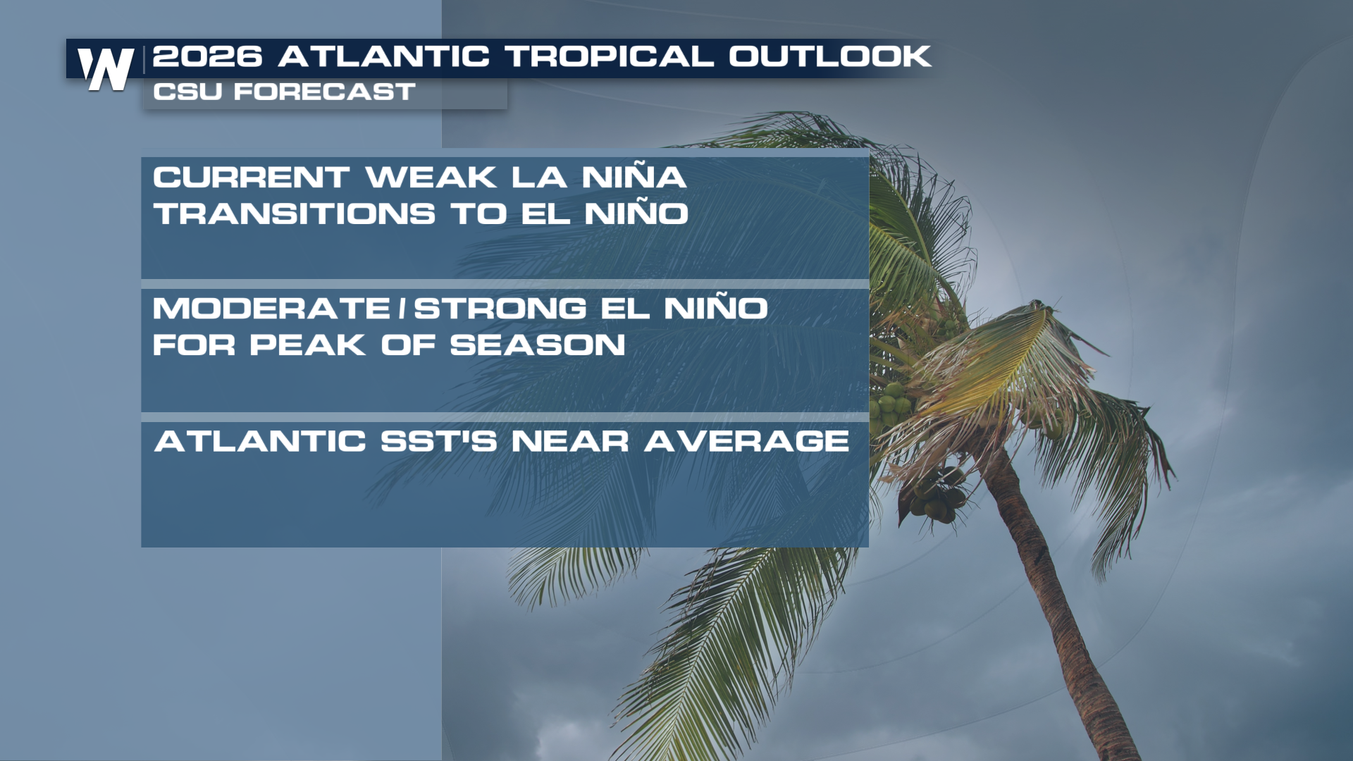 You've probably heard rumblings about the burgeoning El Niños, and possible Super Niño, shaping up in the tropical Pacific. The expectation for an El Niño event during the peak of the 2026 Atlantic Hurricane season is a big factor in CSU's below average forecast, along with near normal sea surface temperatures, which have been much above average in recent seasons.