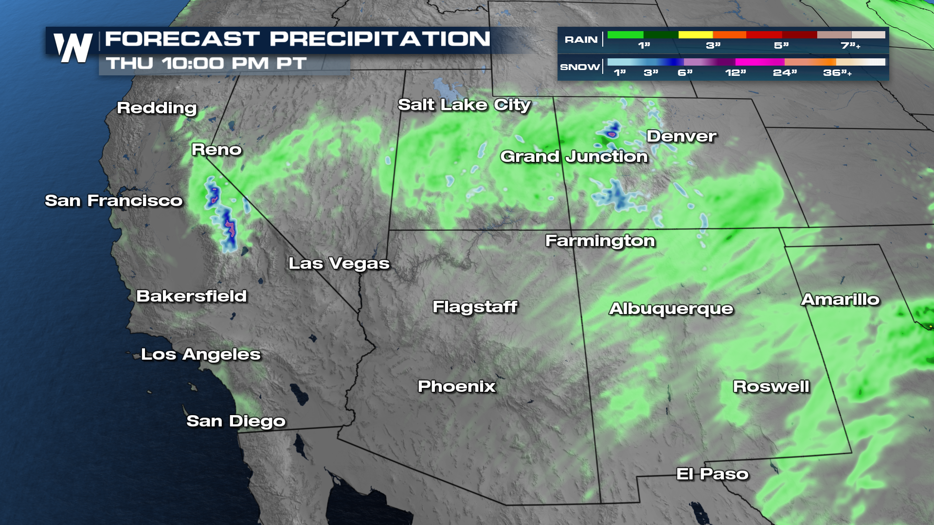 An area of low pressure that's looking for it way is sitting and spinning off of the coast of California. As it gets kicked inland later this week, it's going to bring the unsettled weather with it. It will bring some beneficial rain and snow to parts of the southwest, including California and Colorado. A few inches of snow will be possible in the Sierra Nevada mountains as well as the western slope of the Colorado Rockies.