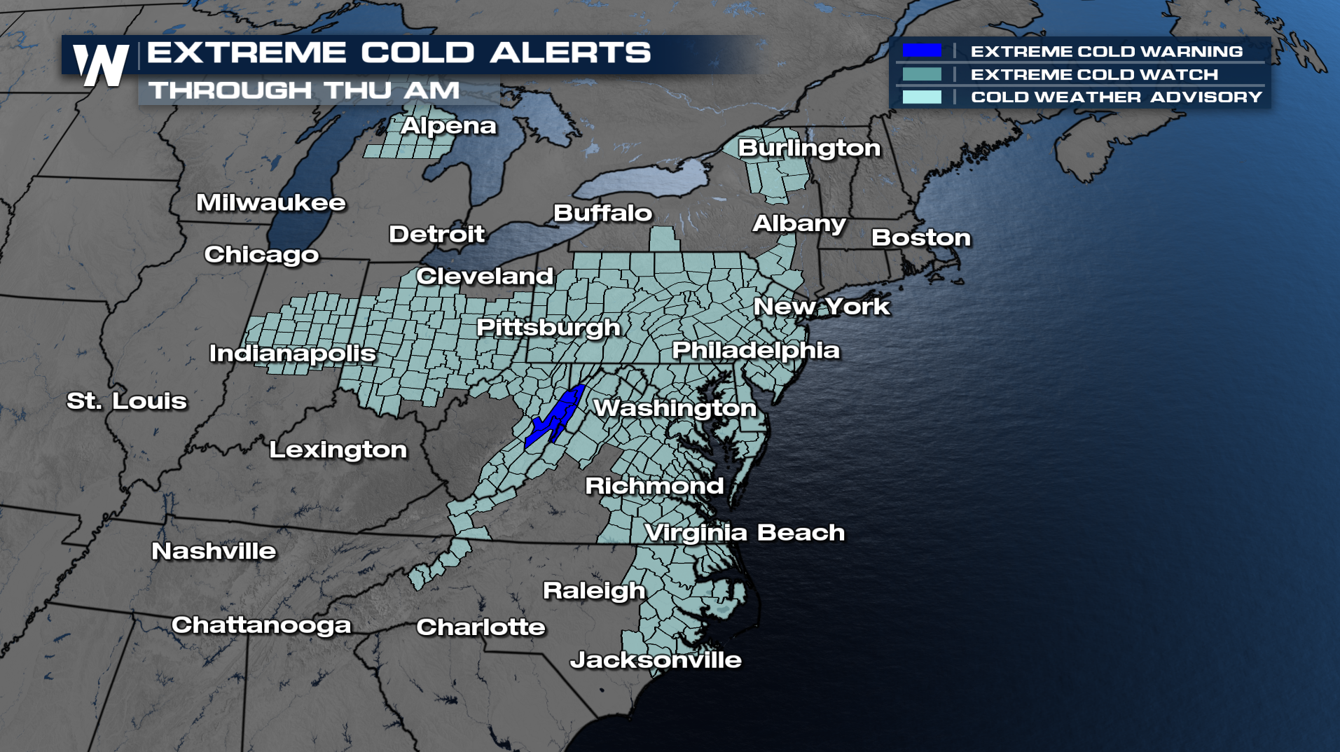 A few cold alerts will stick around through Thursday morning across portions of the Midwest to the Northeast.