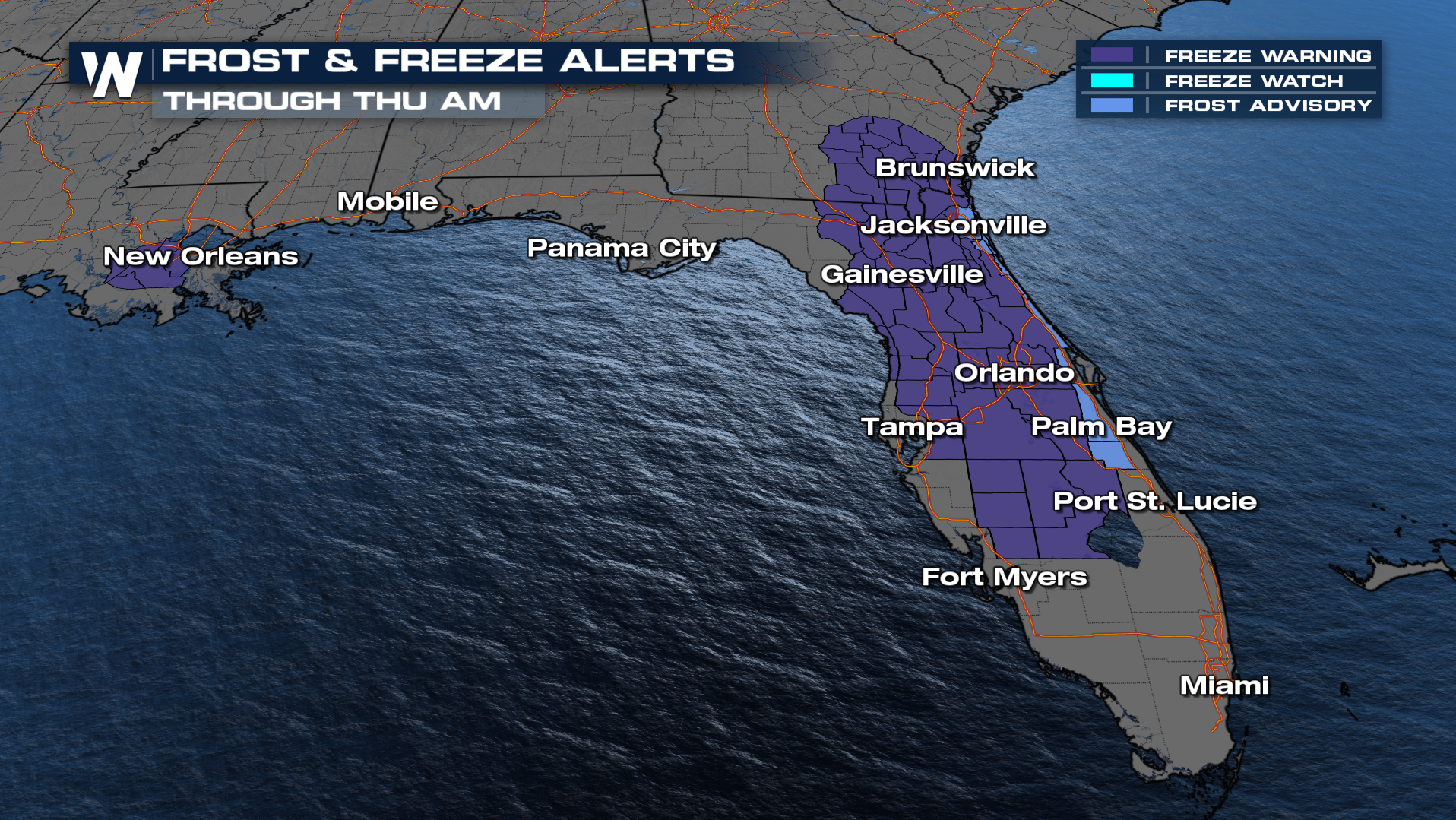 In addition, the cold makes its way all the way down to Florida. Frost and freeze alerts are in effect through Thursday morning across a large area of Florida and south Georgia, as well as some counties in Louisiana.
