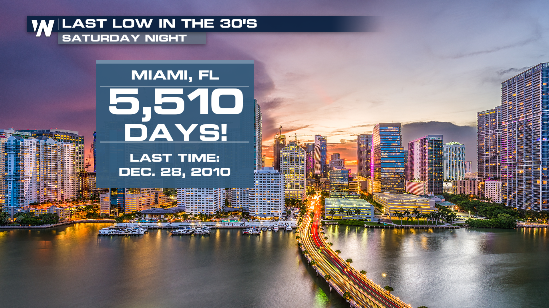 Miami even has a forecast low of 39 degrees on Sunday! If it was to get this low, it'll be the first time in just over 15 years that Miami's seen a low temperature in the 30s!