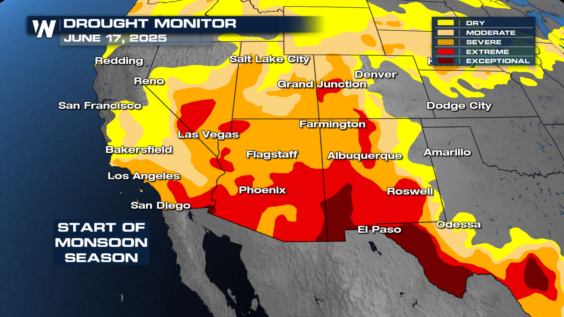 The Drought Monitor mid-June had most of the southwestern U.S. under drought conditions, with New Mexico under the worst of the conditions, under exceptional, level 5 drought.