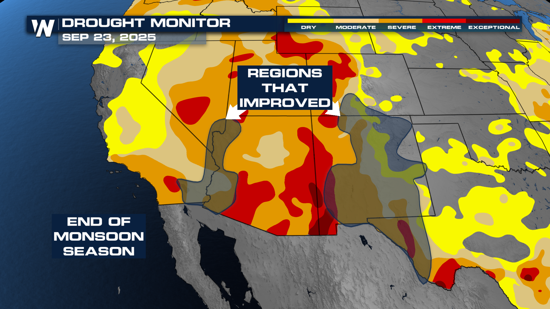 By September 23, the final drought monitor of the season, most of the southwest worsened drought conditions, but the Mojave Desert saw improving conditions, as well as New Mexico, where we needed it.