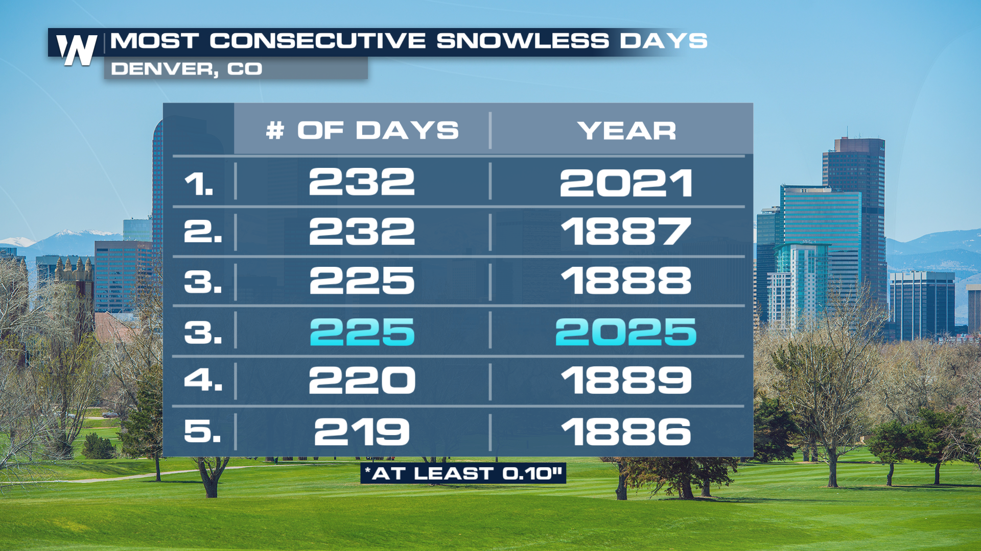 To count as "measurable" snow, it needs to accumulate to at least one-tenth of an inch, which the Denver airport doubled with a quick round of snowfall Saturday morning. The first snow date of November 29th makes it Denver's 2nd latest start to the snow season on record, with 2021 being the only year with a later first snow.