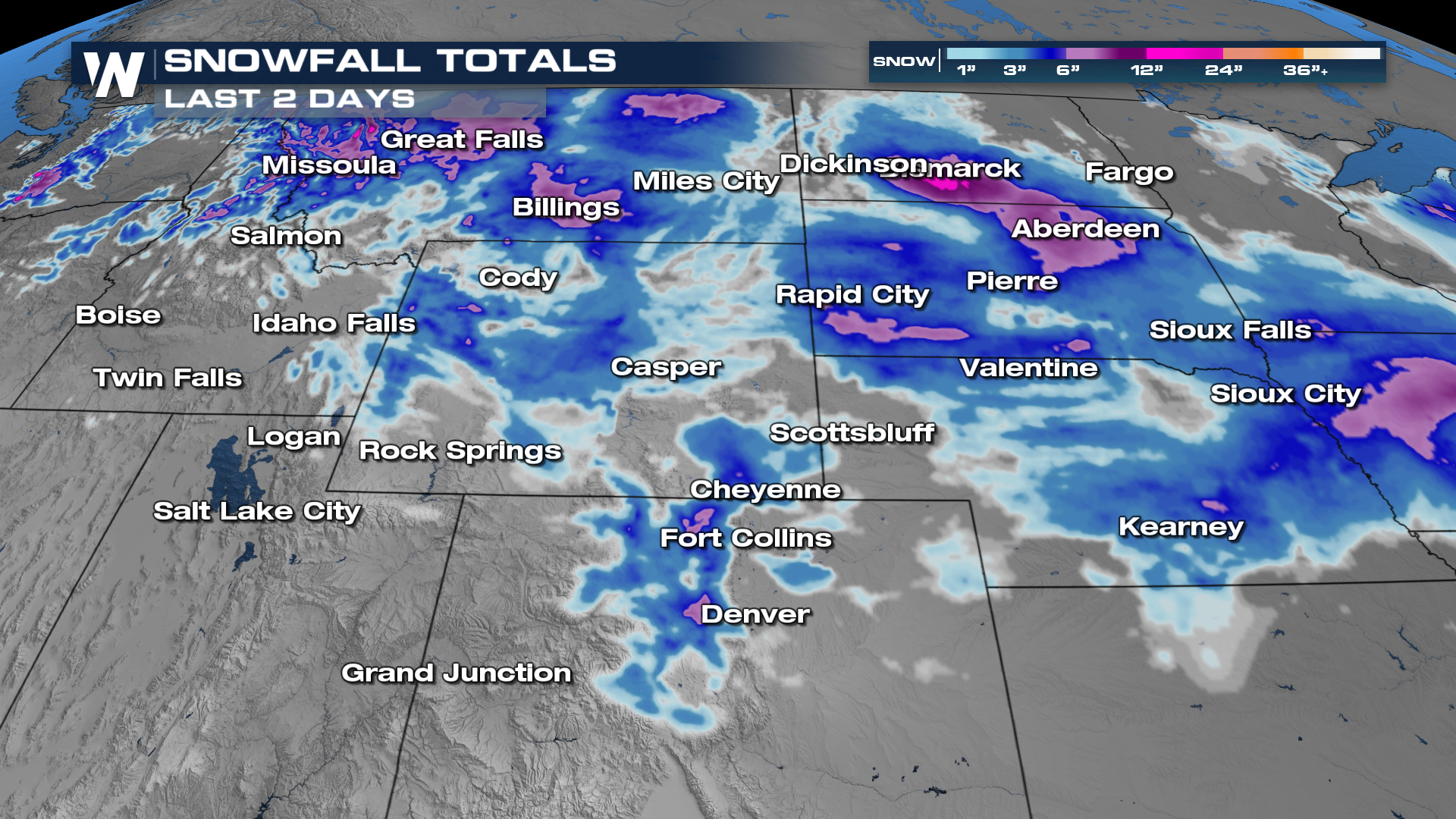 Areas in Montana and Wyoming saw heavier snow, with some totals surpassing 8-10".