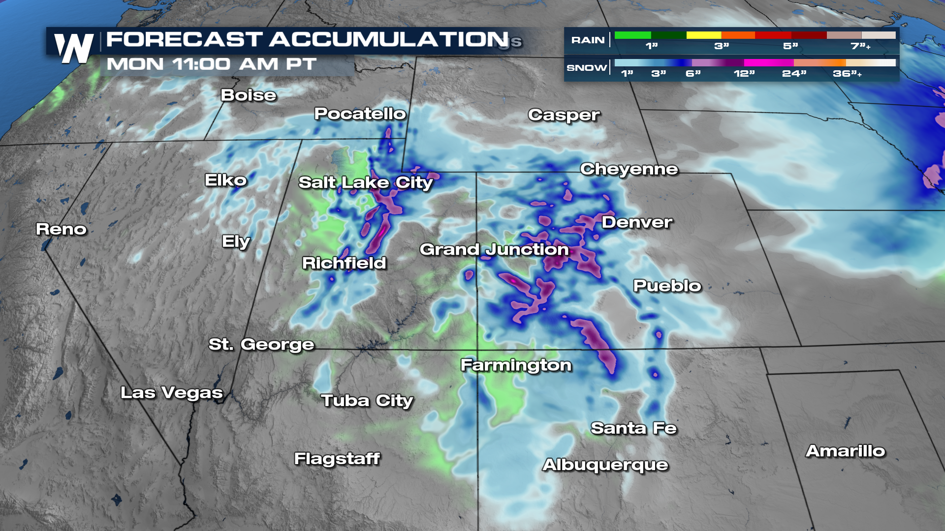 A trailing low pressure system will bring snow back the Mountain West from Sunday into Monday as it dives from Oregon to New Mexico. I-70, I-15, I-84, and I-80 could see snow accumulating on Sunday, causing slow downs to post-Thanksgiving travel.