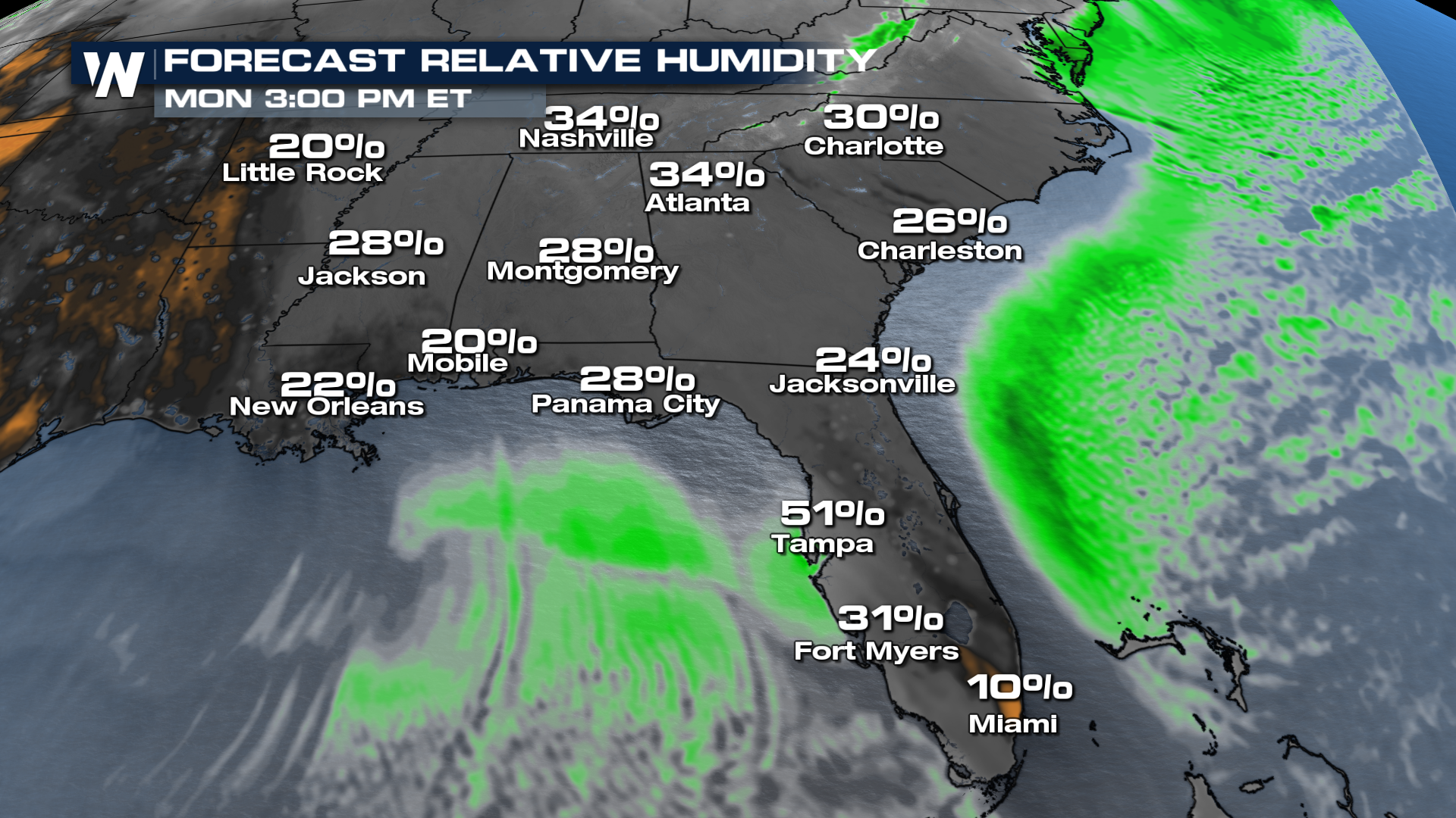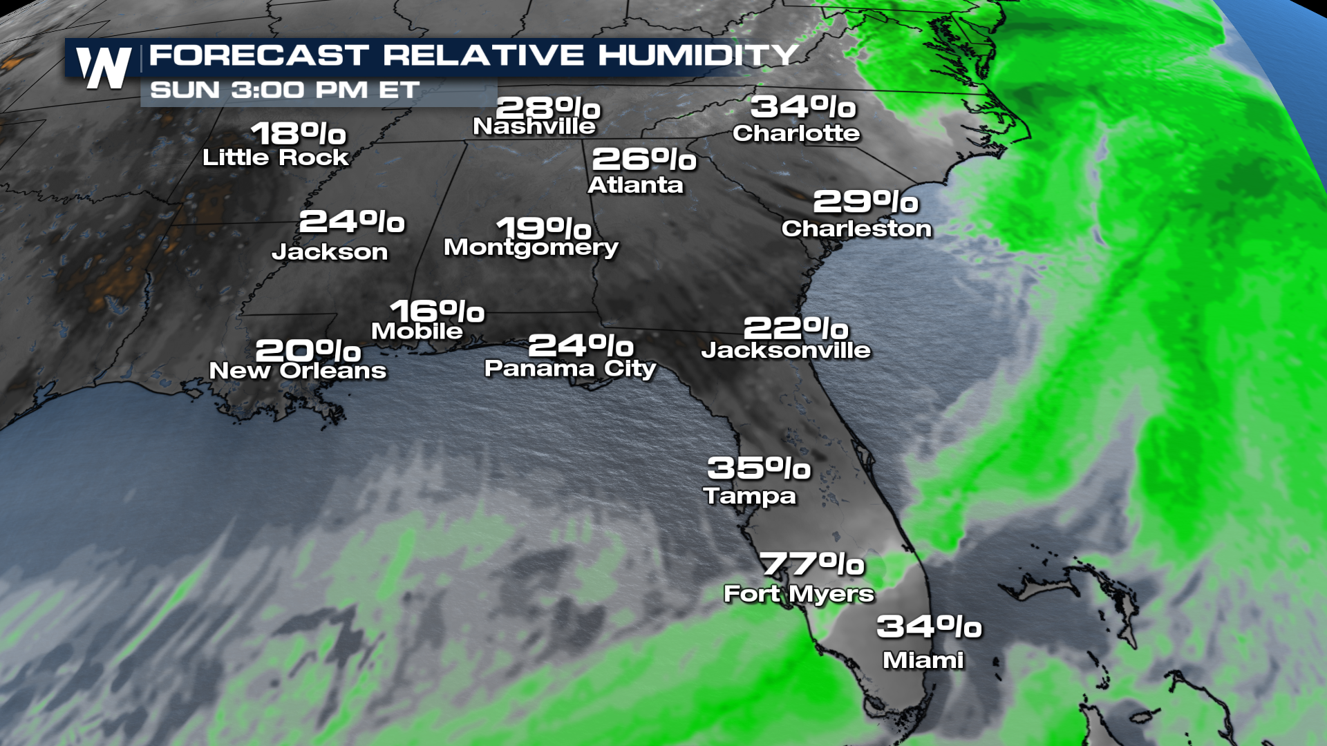 The air will be moving in from the north and will be drier than is normal in areas that are normally semi-tropical. Because of this, relative humidities could drop well below 20% by both Sunday and Monday afternoon.